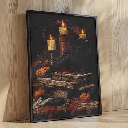 Un corbeau noir se dresse solennellement au sommet d'une pile de vieux livres et de parchemins, entouré de bougies allumées, de feuilles d'automne éparses et de minuscules citrouilles. Cette composition gothique richement détaillée capture un moment calme et mystérieux, parfait pour les amateurs de dark fantasy et de littérature classique. À mesure que vous assemblez les pièces, l'ambiance mélancolique vous entraîne dans un monde de magie, de secrets et de contes aux chandelles.