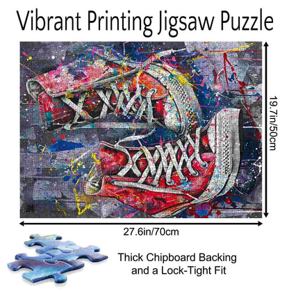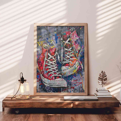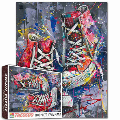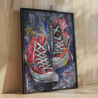Apportez l'énergie de la rue à votre table. Ces baskets rouges usées, parsemées de touches audacieuses de jaune, de bleu et de rose, racontent une histoire de rythme, de liberté et de rébellion quotidienne. Chaque détail, des lacets effilochés à la toile texturée, est empreint de caractère. Sur fond urbain et maussade, ce puzzle capture le rythme du street style dans chaque pièce.