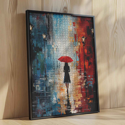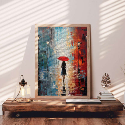 Plongez dans le charme artistique de ce puzzle parapluie rouge. Le contraste saisissant du parapluie rouge sur le fond urbain pluvieux, avec des touches vibrantes de bleu et d'orange, crée une pièce visuellement captivante. Parfait pour les amateurs de puzzles et les amateurs d'art, il ajoute détente et élégance à votre temps libre.