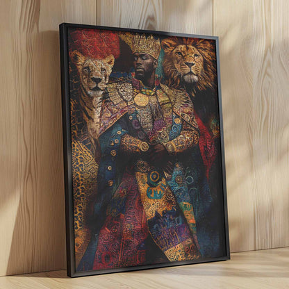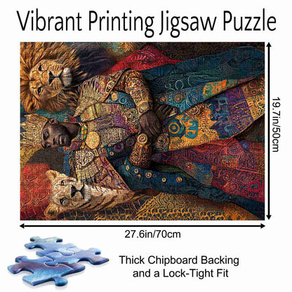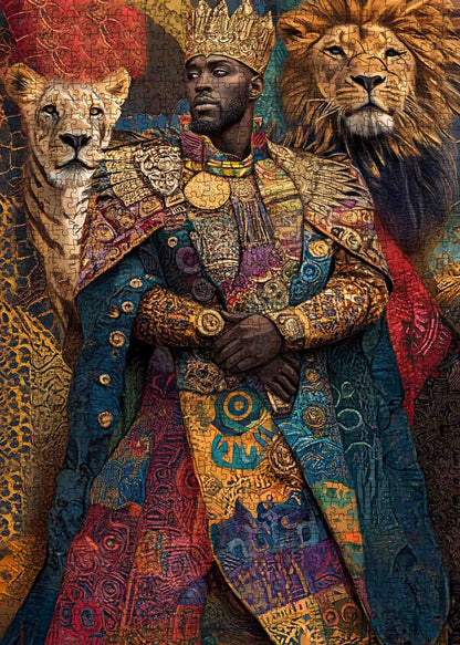 Un roi majestueux se tient aux côtés de lions puissants, symbole de force et de leadership. Ses robes raffinées brillent de couleurs riches, symbolisant sa lignée royale. Le fond vibrant se fond dans la nature, créant une harmonie entre le roi et la nature. Assemblez ce puzzle et ressentez l'énergie royale d'un véritable souverain.