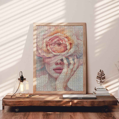 Ce puzzle présente un motif intriguant représentant une femme aux yeux délicatement recouverts d'une rose, mêlant beauté naturelle et une touche de mystère. Les tons roses doux et les détails délicats créent une atmosphère paisible et captivante à chaque pièce. Idéal pour les amateurs de puzzles appréciant les designs uniques et artistiques, ce puzzle offre à la fois un défi et une expérience visuelle époustouflante.
