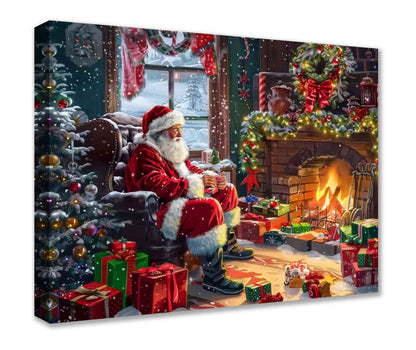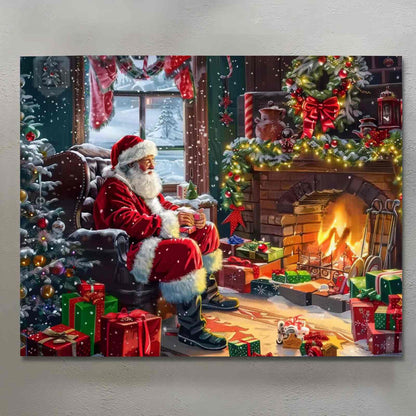 Le Père Noël profite d'un moment de calme à la lueur chaleureuse d'une cheminée crépitante, entouré de cadeaux joliment emballés et d'une décoration festive. La pièce douillette, ornée d'un sapin de Noël et d'une couronne de Noël, crée une scène accueillante qui capture la magie et la chaleur de la veille de Noël. Imaginez cette œuvre d'art réconfortante dans votre maison, apportant l'esprit de Noël et la joie de la période des fêtes dans votre espace.
