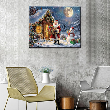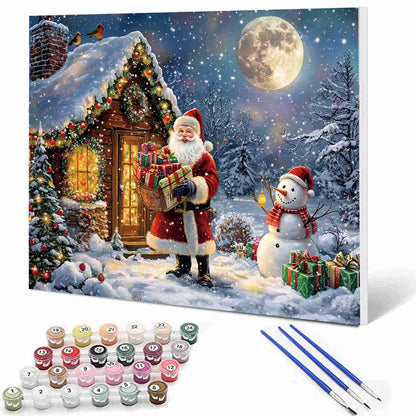 Capturez la magie de Noël avec ce kit de peinture par numéros enchanteur. Le Père Noël livre des cadeaux dans un charmant chalet recouvert de neige baigné par la douce lueur du clair de lune. La scène est complétée par un sympathique bonhomme de neige et des lumières scintillantes, créant un pays des merveilles hivernal parfait. Donnez vie à la joie de Noël à chaque coup de pinceau !