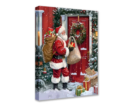 Le Père Noël se tient devant une porte rouge recouverte de neige, les bras remplis de sacs cadeaux, apportant chaleur et joie à la froide nuit de Noël. Avec une couronne douillette et des cadeaux joliment emballés, cette scène capture l'essence des cadeaux de Noël. C'est comme si le Père Noël venait d'entrer dans votre maison, prêt à répandre la joie. Un ajout saisonnier parfait à n'importe quelle pièce, mêlant nostalgie et magie festive. Cette toile incarne l'esprit des fêtes, ce qui la rend idéale pour les amoureux des animaux et ceux qui chérissent la décoration de Noël.