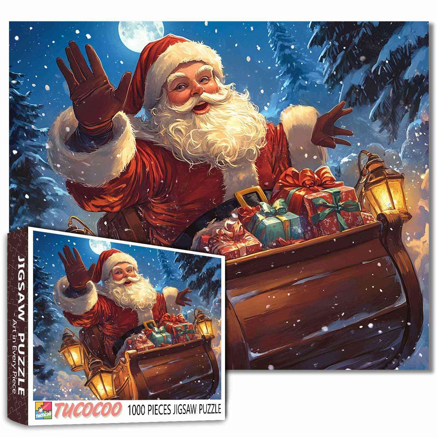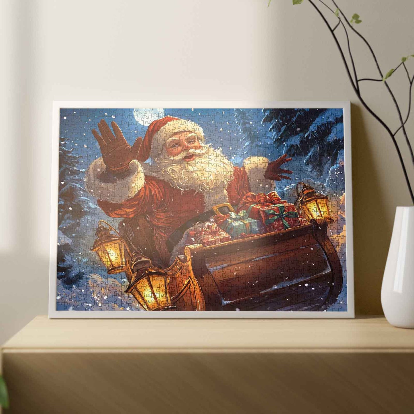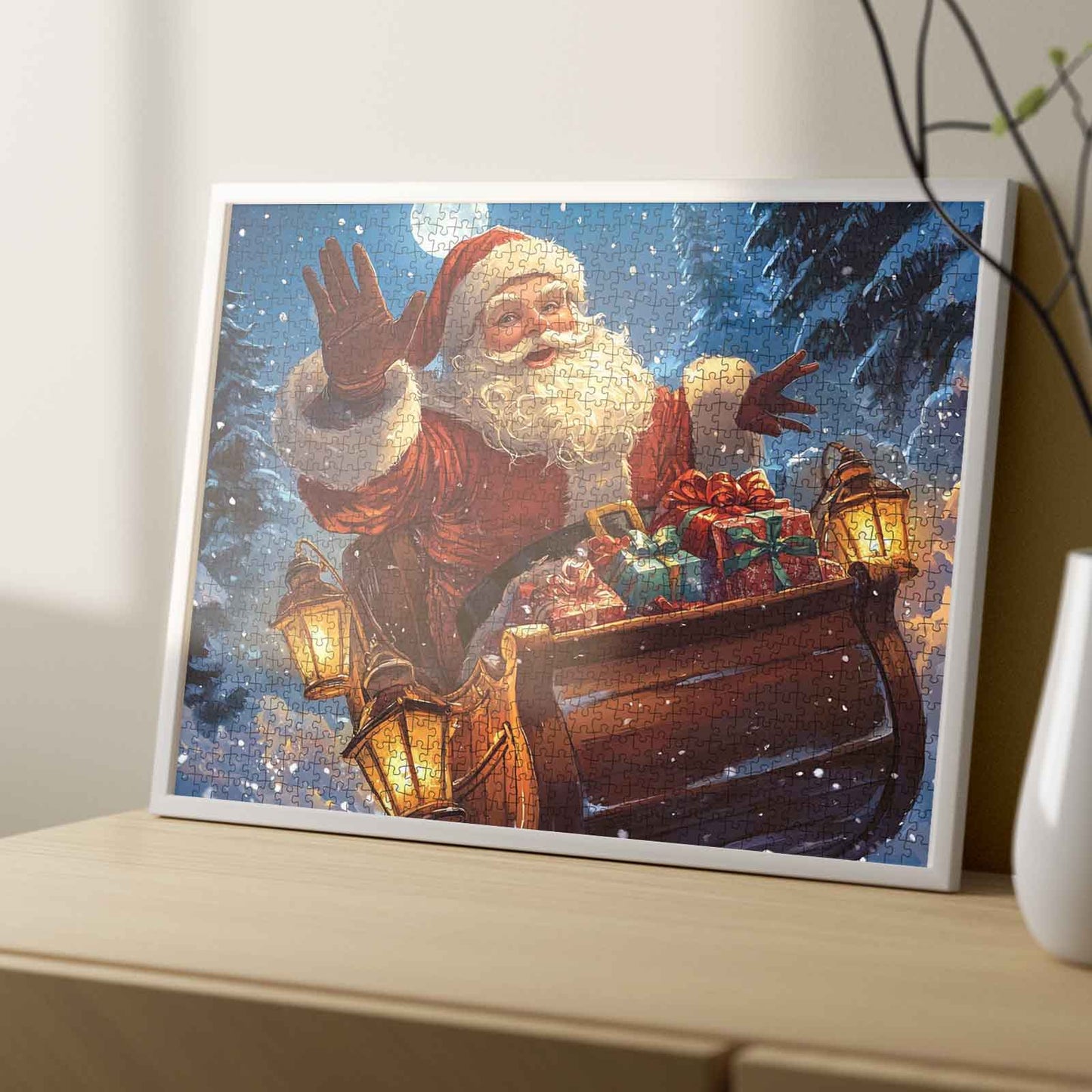 Imprégnez-vous de la magie de Noël tandis que le Père Noël vous salue joyeusement depuis son traîneau, débordant de cadeaux colorés et de lanternes lumineuses. Sur fond de forêt enneigée éclairée par la lune, ce décor enchanteur capture l'esprit de générosité et l'excitation du voyage du Père Noël. Un défi délicieux pour les fêtes de fin d'année, idéal pour les soirées casse-tête en famille.