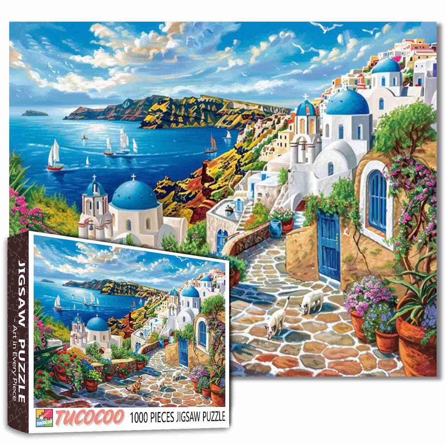 Des chemins pavés serpentent entre des bâtiments emblématiques blanchis à la chaux et des toits aux dômes bleus, tandis que des fleurs éclatantes jaillissent de chaque recoin. Le soleil scintille sur la mer Égée tandis que de douces vagues portent les voiliers le long du village à flanc de falaise. Des chèvres déambulent nonchalamment dans les ruelles, et un chien se repose à l'ombre, s'imprégnant du charme paisible de la vie insulaire. Une escapade méditerranéenne qui prend vie petit à petit.