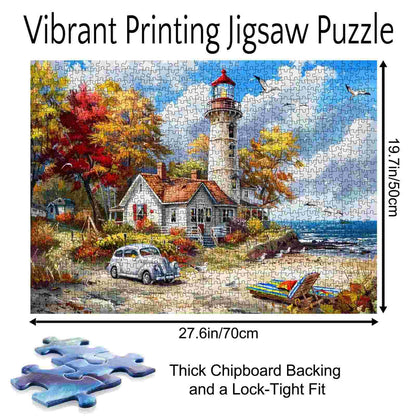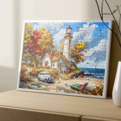Les feuilles dorées dansent dans la brise côtière fraîche tandis qu'un phare majestueux veille sur les douces vagues. Un cottage douillet se niche à ses côtés, ses fenêtres rayonnant de la chaleur d'un foyer. Une voiture ancienne repose tranquillement sur la route sablonneuse, tandis qu'une chaise de plage rayée et un kayak évoquent les après-midis de farniente au bord de la mer. Les mouettes glissent dans le ciel, complétant cette escapade balnéaire automnale sereine. Ce puzzle capture le charme de la vie côtière en automne : paisible, colorée et imprégnée d'une nostalgie intemporelle.