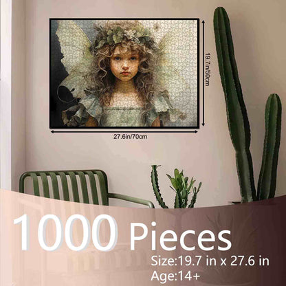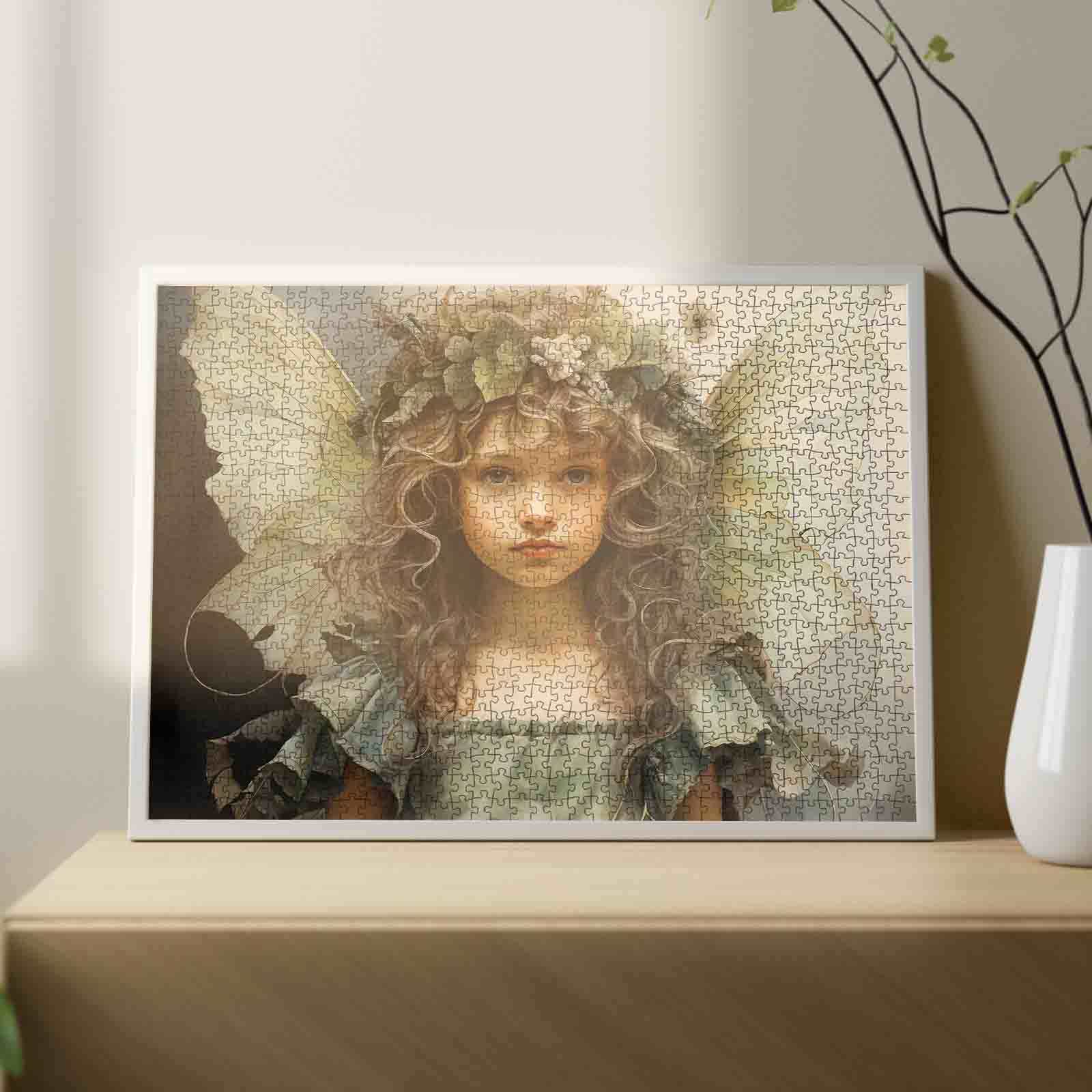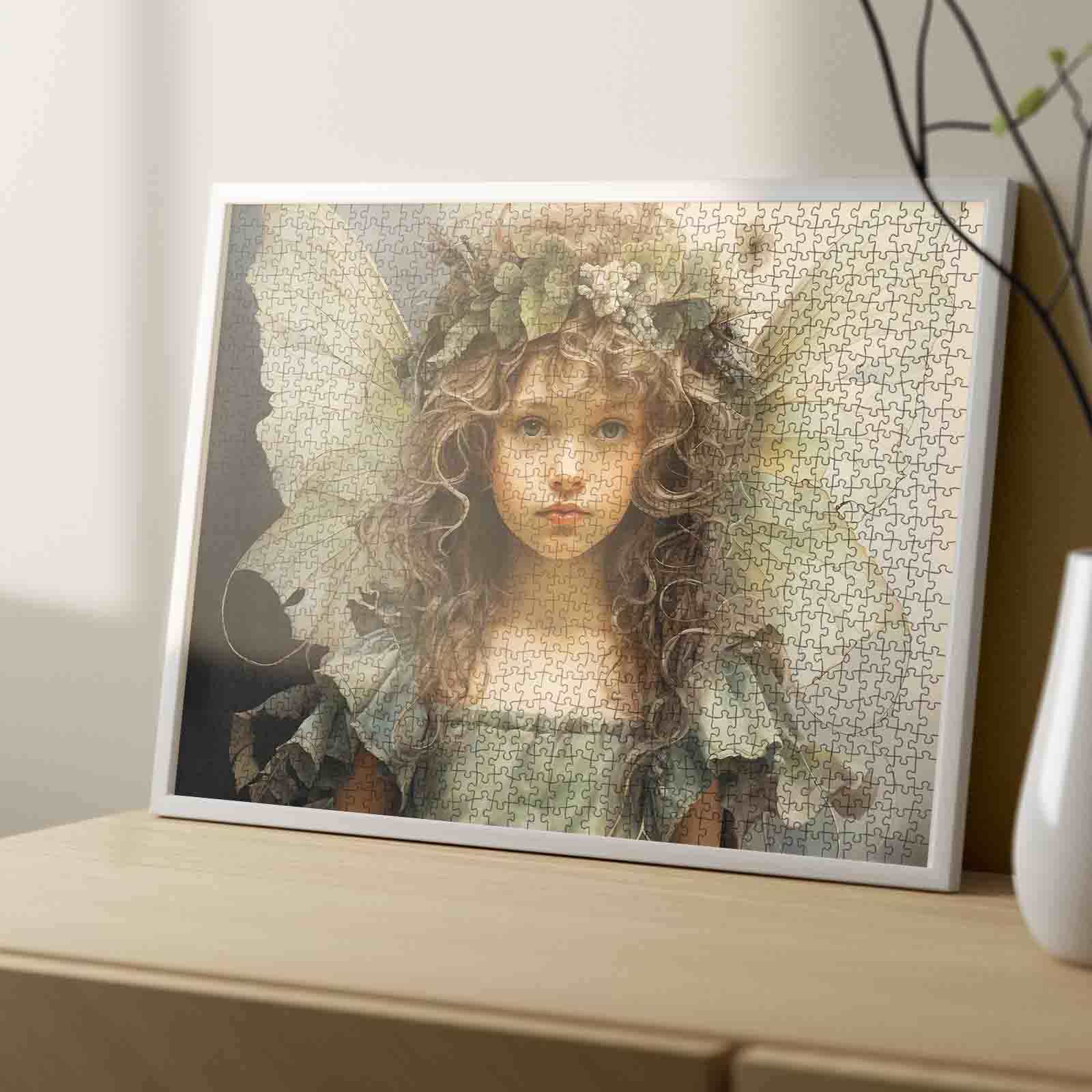 Une jeune fée aux cheveux doux et bouclés se tient avec grâce et sérénité, le regard fixé vers l'avant. Elle porte une couronne de feuilles et de fleurs vertes, et des ailes translucides se déploient derrière elle. Les tons pastel doux et l'expression tendre confèrent à l'image un calme onirique, comme capturée dans le calme d'une clairière enchantée. Un puzzle qui offre plus que de la beauté : il vous invite à un monde merveilleux.