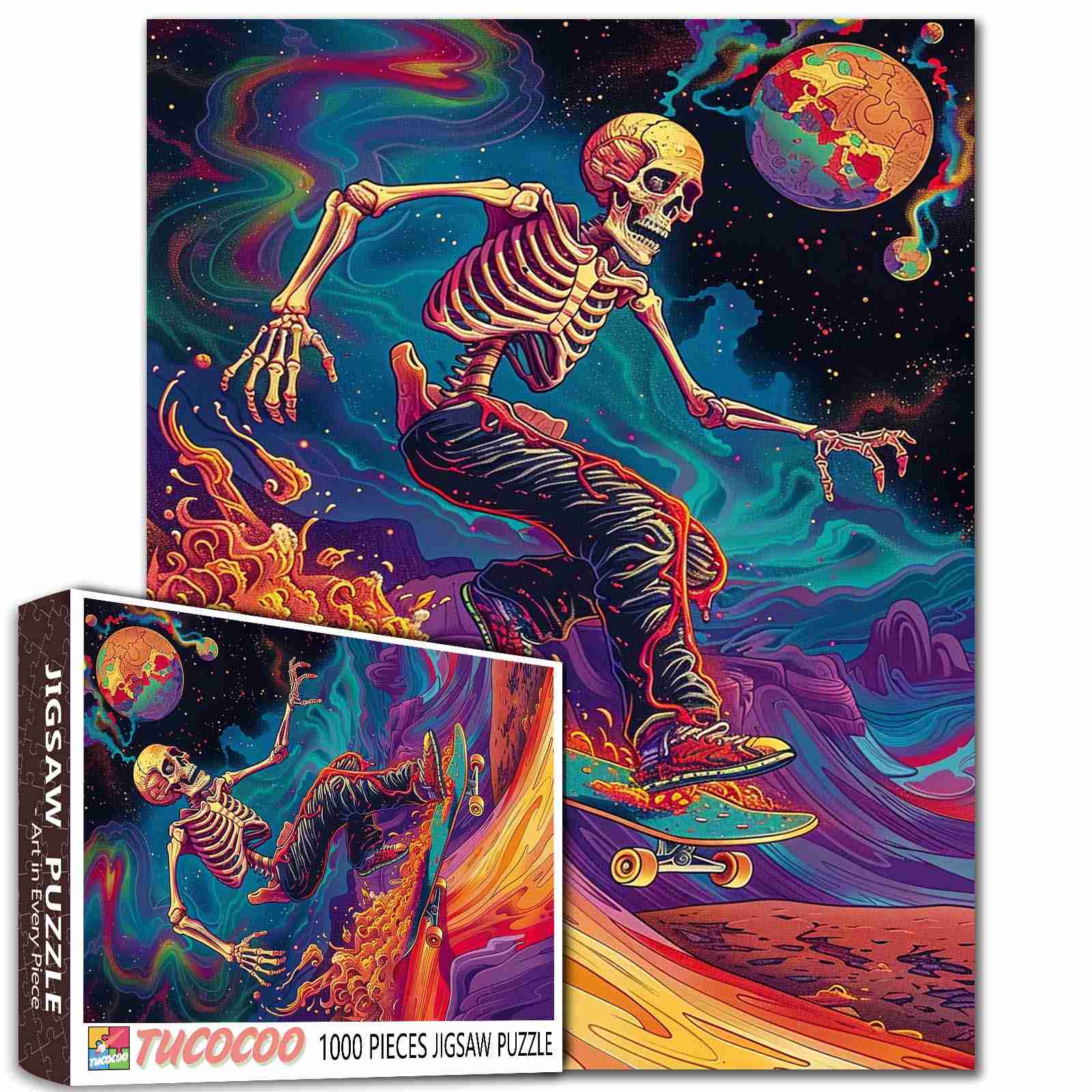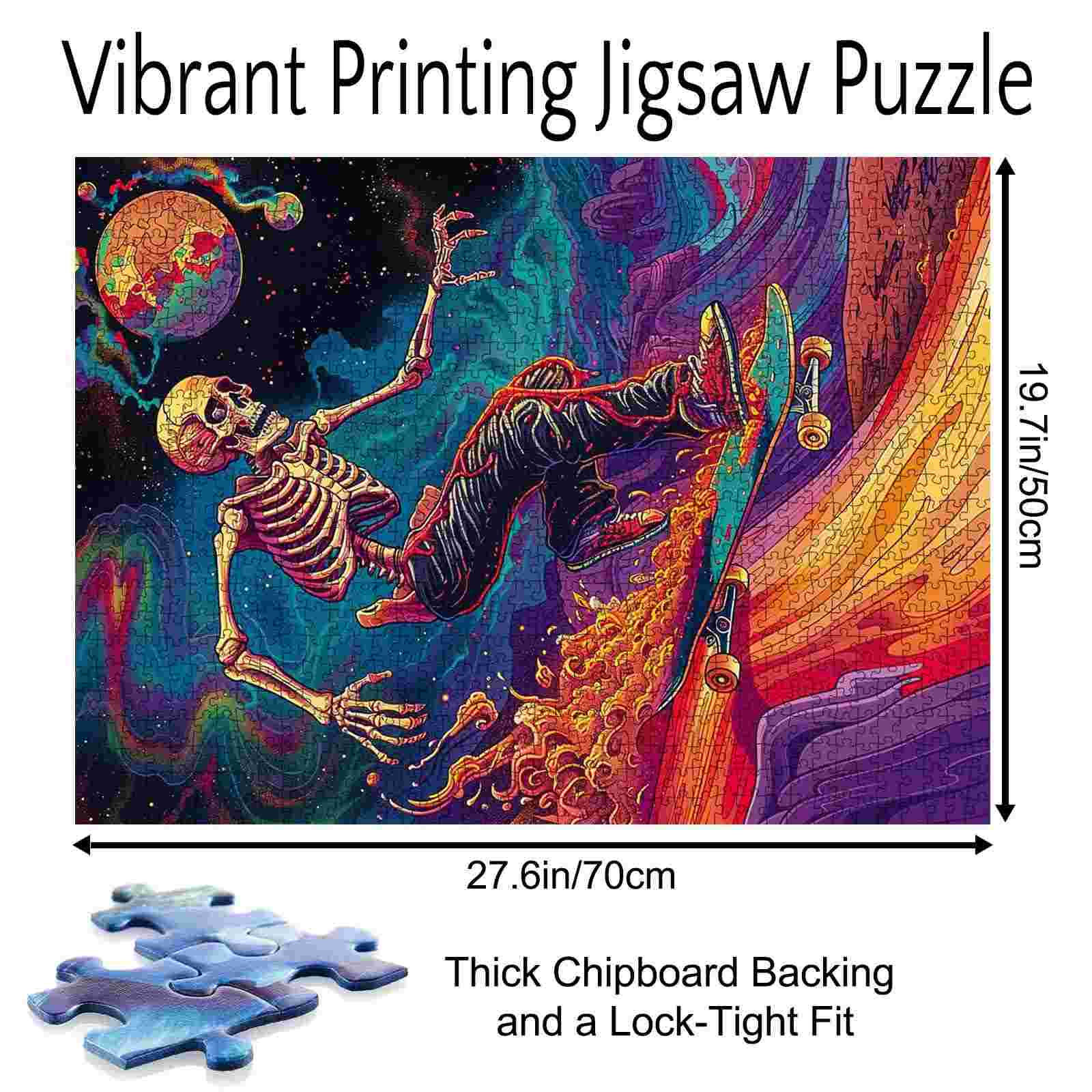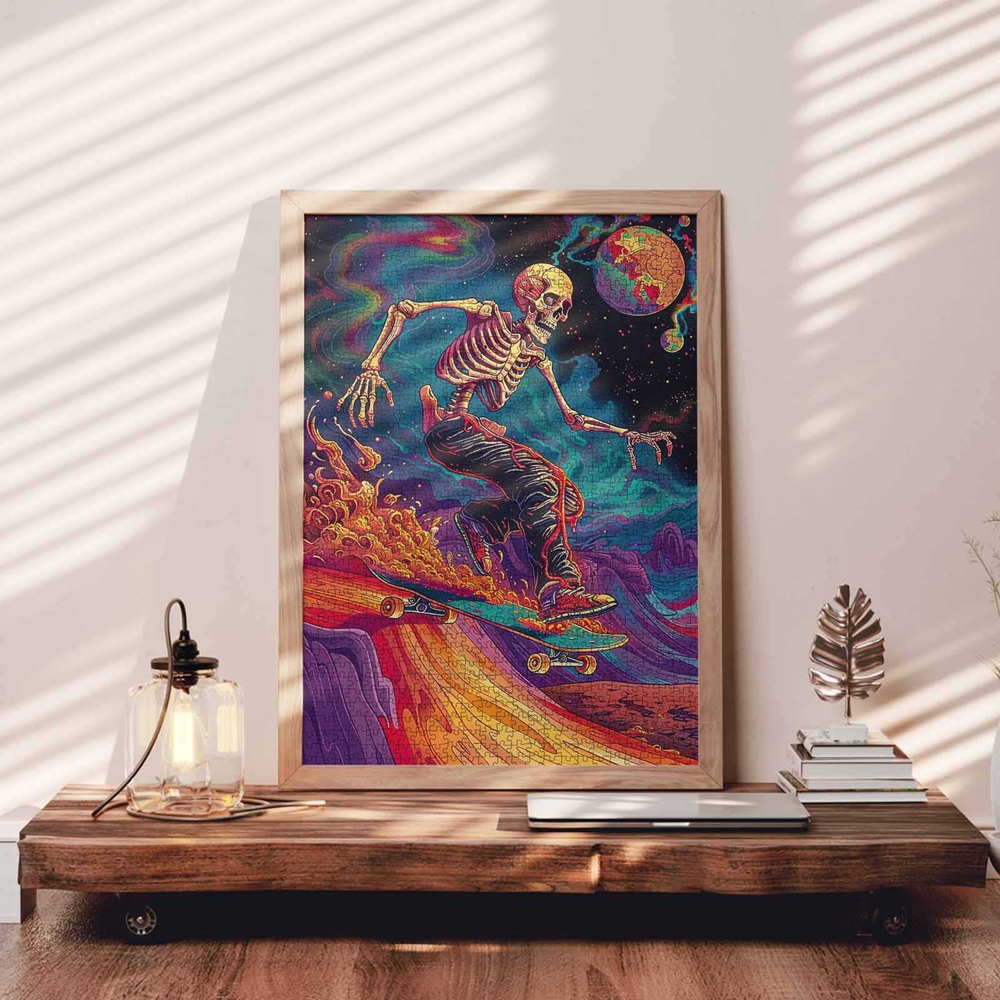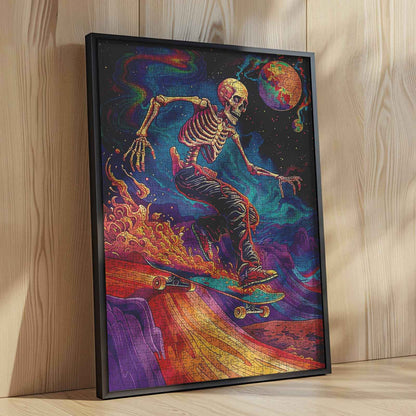 Un squelette intrépide dévale une rampe de lave sur un skateboard, tandis que des planètes lointaines et des étoiles néon illuminent le décor cosmique. Vêtu de baskets et de vêtements streetwear, il fonce à travers l'espace avec une énergie irrésistible, laissant une traînée de feu sous ses roues. Un mélange surréaliste de rébellion, de fantasy et de frisson intergalactique.