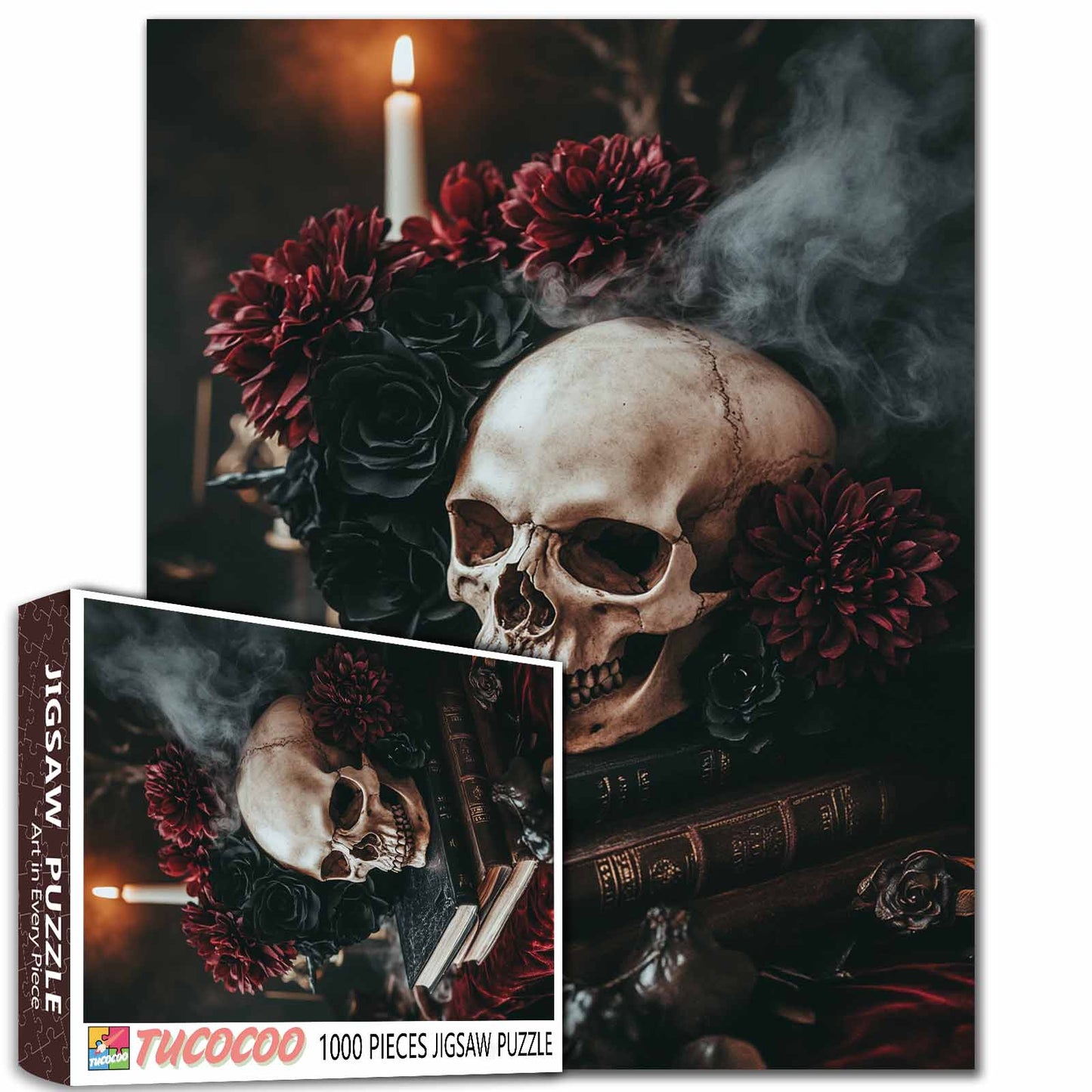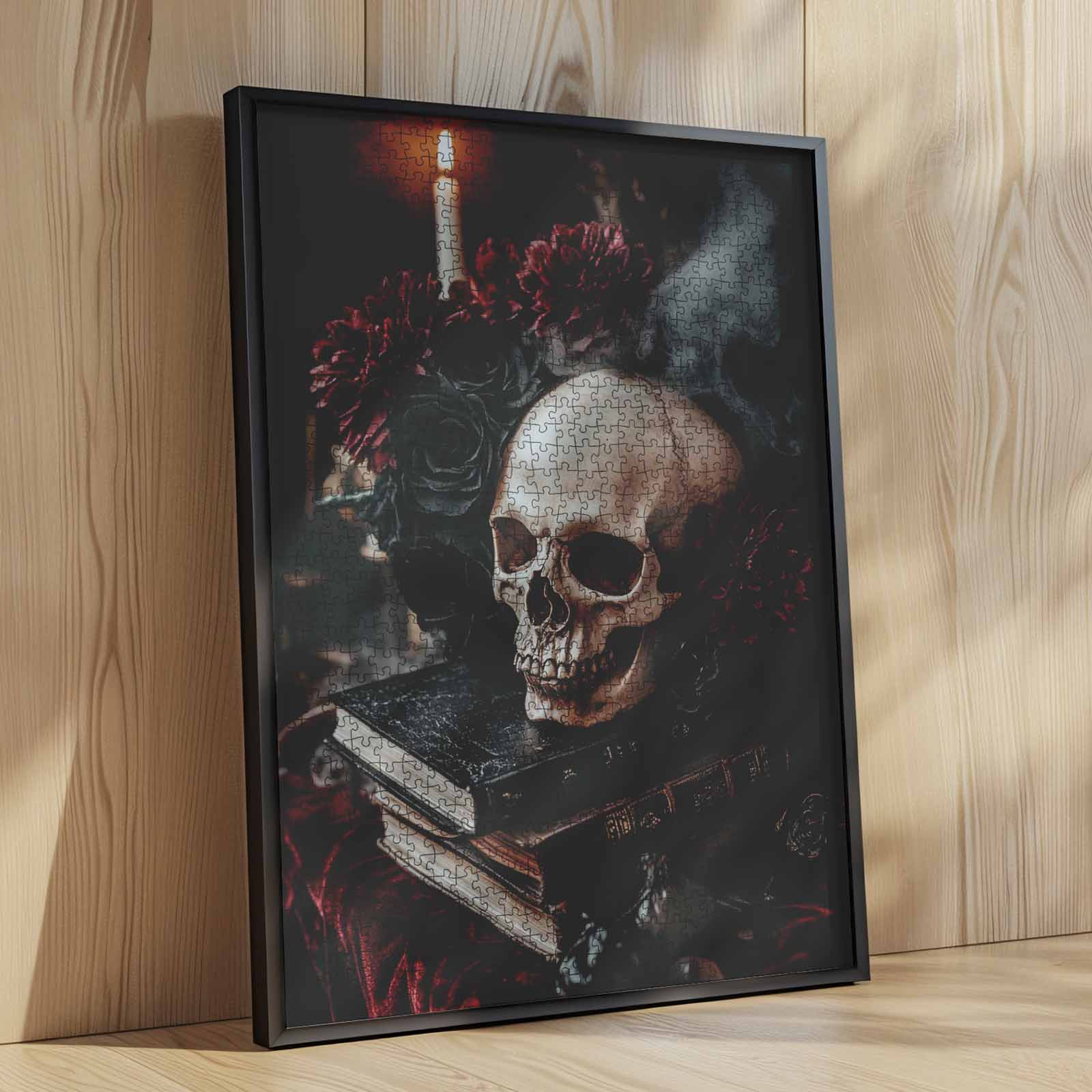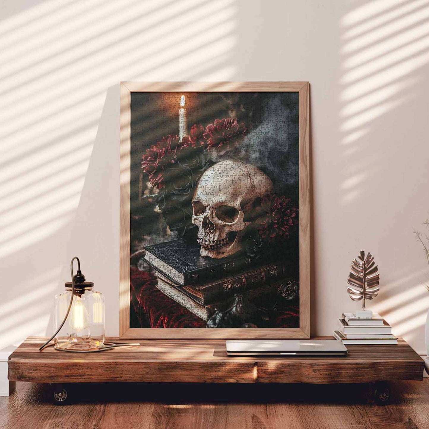 Un crâne solitaire repose sur une pile de livres usés, encadré de roses rouge foncé et noires, sous la lueur vacillante d'une bougie. Des volutes de fumée tourbillonnent dans l'air, tissant une histoire mystérieuse, presque oubliée. Chaque pièce vous plonge dans une atmosphère envoûtante, où savoir oublié et beauté intemporelle s'entremêlent discrètement dans la faible lueur d'une chambre secrète.