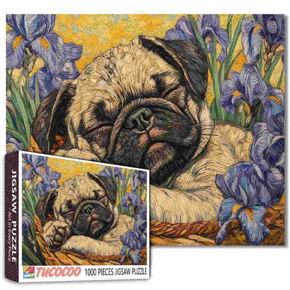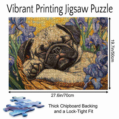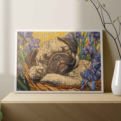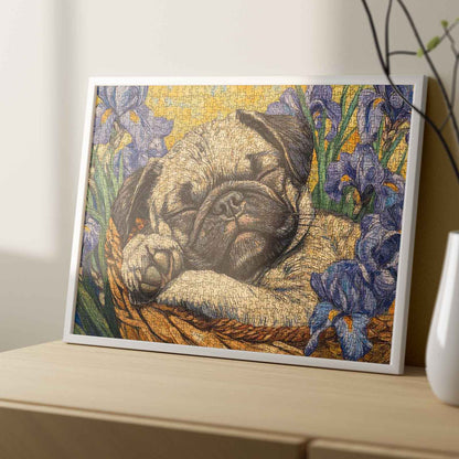 Un carlin paisible fait une sieste dans un panier, entouré de magnifiques iris, incarnant la détente et la chaleur. Ce puzzle réconfortant capture le moment serein d'un petit carlin au repos, offrant une expérience calme et agréable à reconstituer.