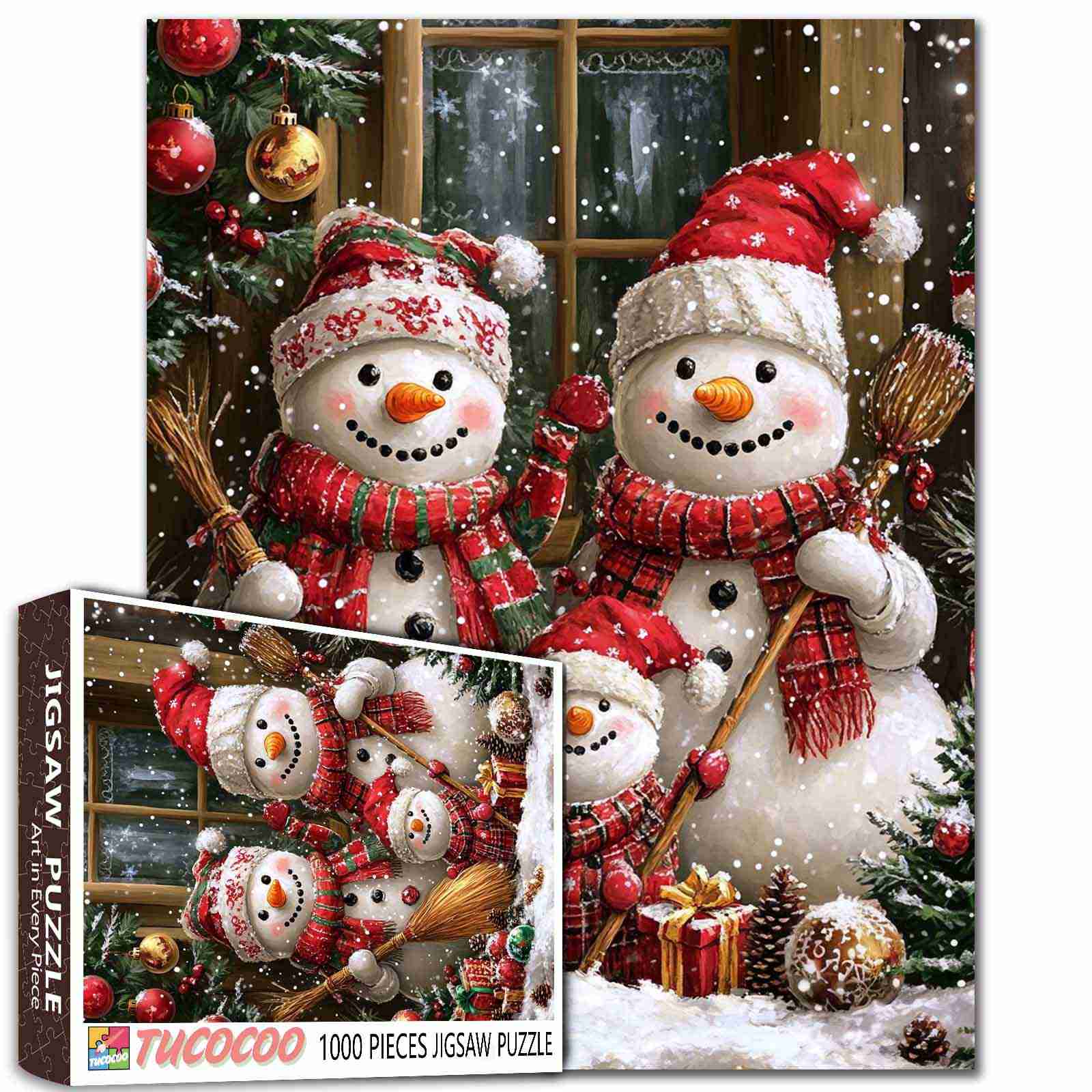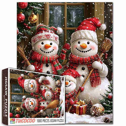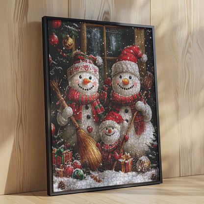 Un moment d'hiver réconfortant se déroule alors qu'une joyeuse famille de bonhommes de neige se rassemble près de la fenêtre, emmitouflée dans des écharpes et des bonnets rouges et verts. La neige tombe doucement à l'extérieur tandis qu'une lumière dorée brille à l'intérieur du chalet douillet. Entourés de cadeaux emballés et de décorations de Noël, les trois bonhommes de neige – deux adultes et un enfant – saisissent des balais en bois et affichent une expression joyeuse, capturant l'esprit d'un réveillon de Noël magique.