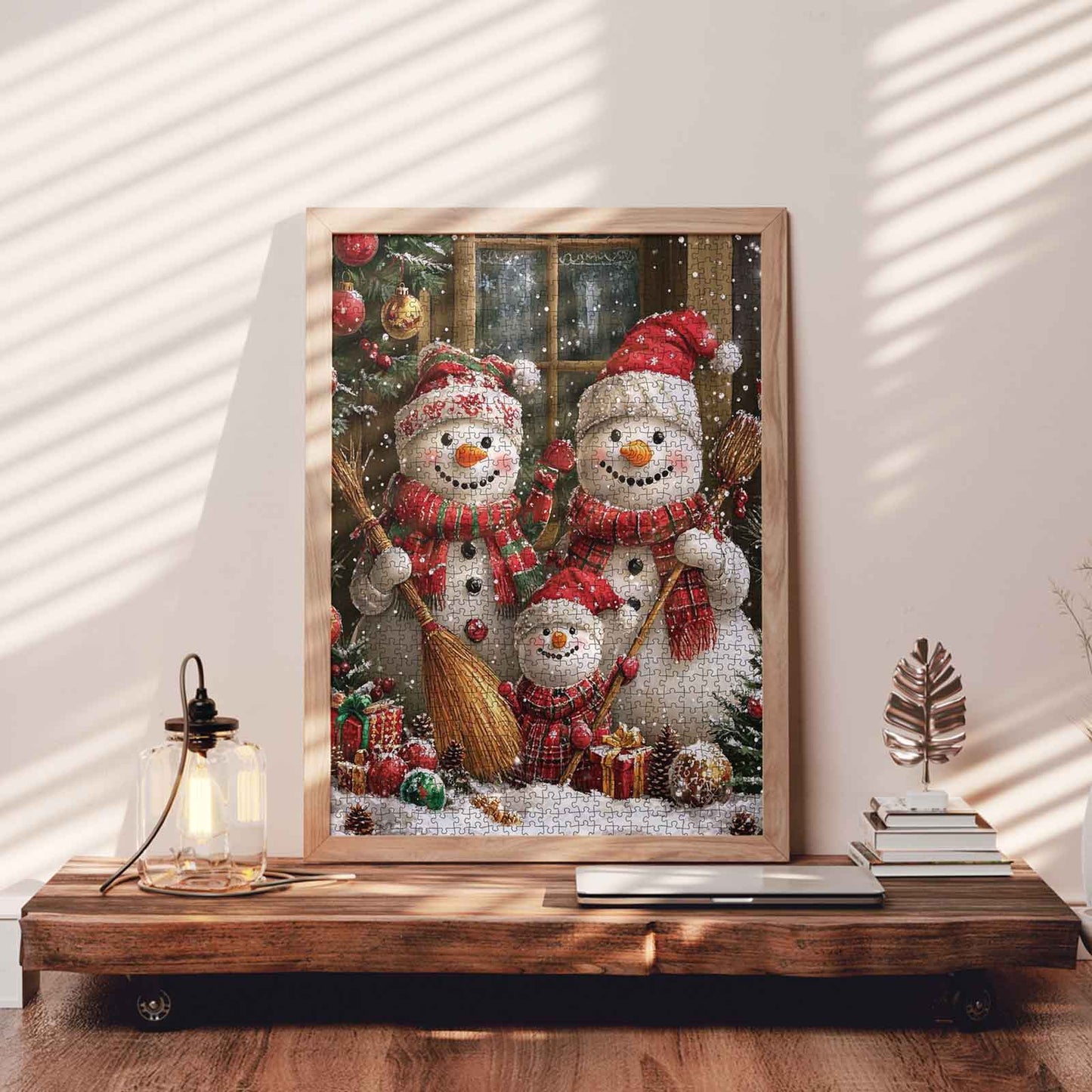 Puzzle Famille de bonhommes de neige près de la fenêtre