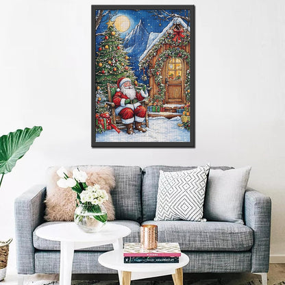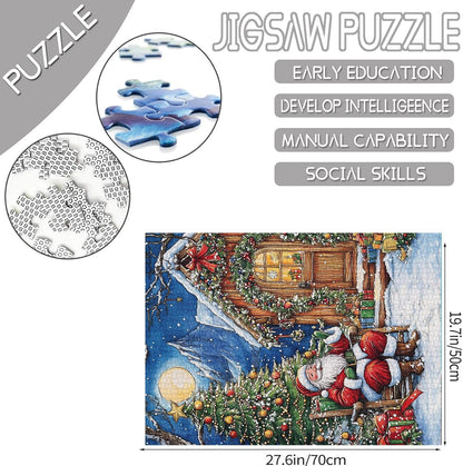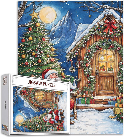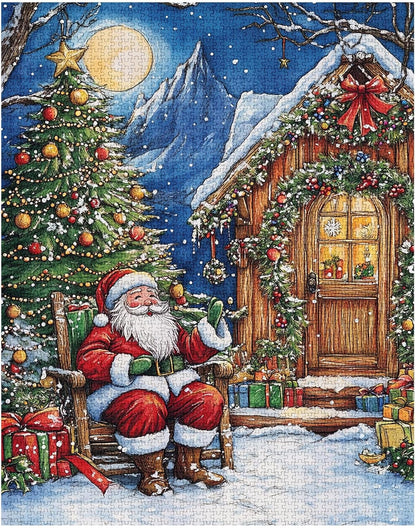 - Ce charmant puzzle de Noël représente le Père Noël assis près d'un chalet douillet, entouré de cadeaux et d'un paysage hivernal enneigé. La lueur chaleureuse des fenêtres du chalet et les étoiles scintillantes créent une atmosphère magique, parfaite pour se mettre dans l'esprit des fêtes.