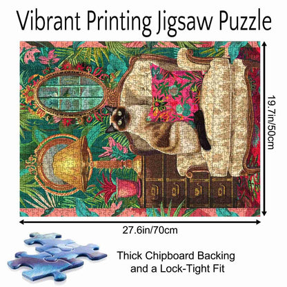 Un majestueux chat siamois trône gracieusement sur un fauteuil orné, dégageant une atmosphère mystérieuse et charmante. Le décor tropical, le mobilier vintage et les motifs complexes créent une scène d'une élégance raffinée. Chaque pièce de ce puzzle vous plonge dans un univers de sophistication, un véritable défi pour les amoureux des chats comme pour les amateurs d'art.