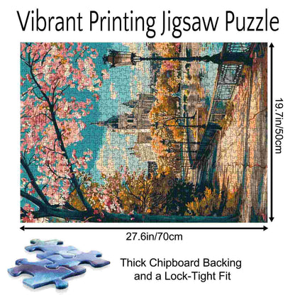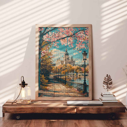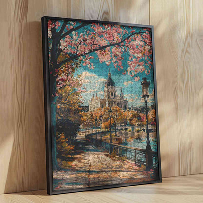 Promenez-vous sous les cerisiers en fleurs, tandis que la lumière dorée se répand sur une promenade au bord de l'eau. Ce puzzle apaisant guide votre regard vers une cathédrale majestueuse dominant la cime des arbres. Bordée de lampadaires, de reflets sur l'eau et de feuillages printaniers en fleurs, chaque pièce capture une journée paisible dans une vieille ville européenne. Une escapade idéale pour les amoureux de nature et d'architecture.