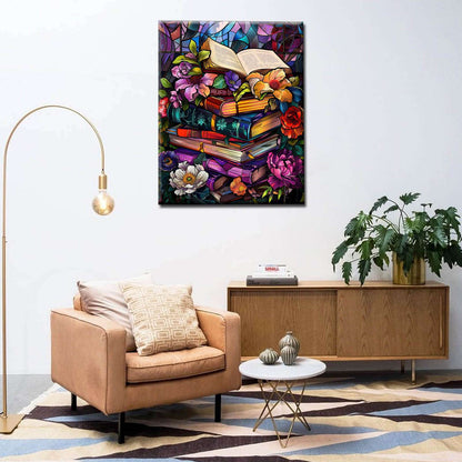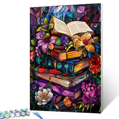 Créez un chef-d'œuvre éblouissant avec cette peinture par numéros comprenant une pile de livres vibrante ornée de fleurs en fleurs, le tout rendu dans un superbe style vitrail. Les motifs complexes et les couleurs riches apportent une touche artistique, parfaite pour se détendre et embellir votre espace. Idéal pour les débutants et les amateurs d'art.