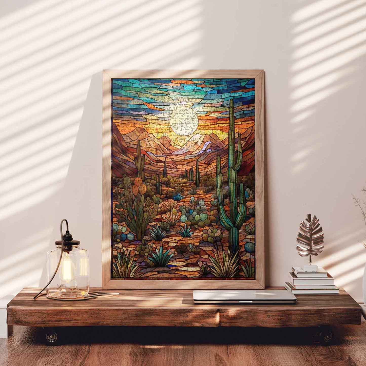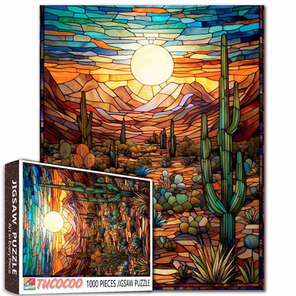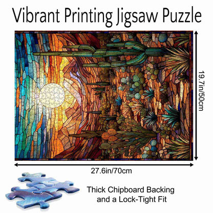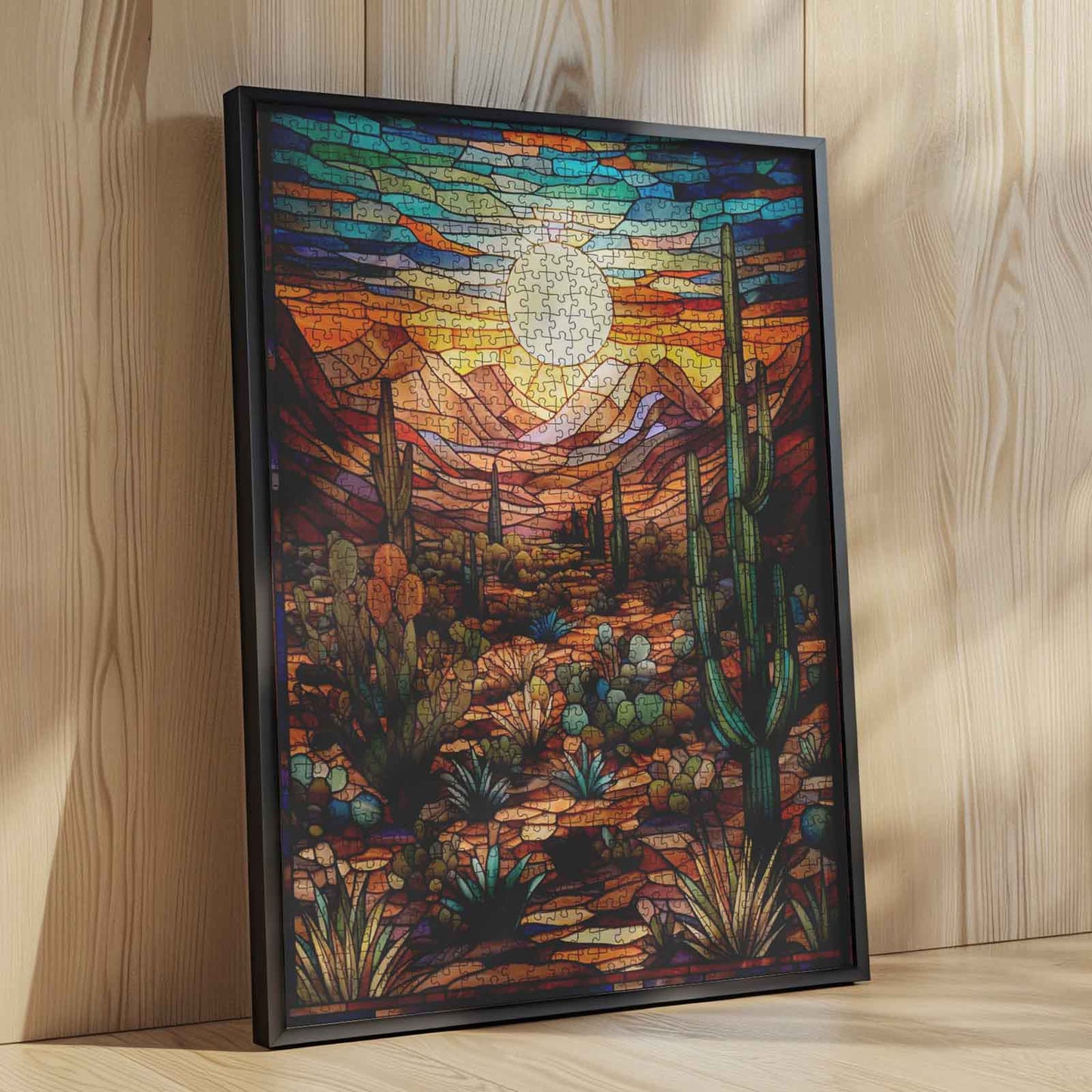 Plongez dans la chaleur rayonnante du désert à l'heure dorée. Ce puzzle façon vitrail capture un paysage serein du sud-ouest baigné des riches tons du coucher de soleil. Cactus imposants, montagnes escarpées et bouquets de flore désertique sont soulignés de lignes audacieuses et agrémentés de nuances vives d'ambre, de turquoise et de violet. Le soleil éclatant au centre anime l'ensemble, créant une mosaïque de calme, de couleurs et de beauté naturelle.