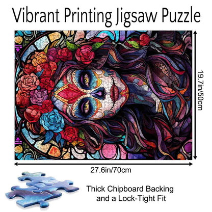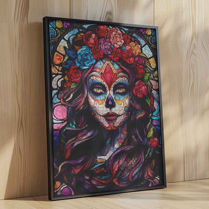 Une femme saisissante regarde droit devant elle, le visage orné de crânes en sucre complexes, encadré d'une couronne de roses éclatantes. Cette œuvre mêle l'esprit du Día de los Muertos à l'élégance du vitrail, créant une fusion saisissante de couleurs, de symbolisme et de féminité. Son regard expressif et sa chevelure flottante sont saisis par des lignes tourbillonnantes et des teintes précieuses, faisant de chaque pièce du puzzle une petite fenêtre sur la célébration, le souvenir et la beauté artistique. Parfait pour les amateurs de culture, de théâtre et d'expression vivante.