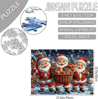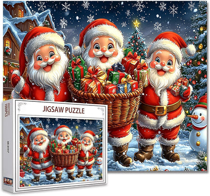 - Ce puzzle festif met en scène trois joyeux Pères Noël livrant des cadeaux dans un village de Noël enneigé. C'est un défi amusant pour tous les âges et constitue une charmante décoration de Noël. Avec ses couleurs vives et son design charmant, ce puzzle ne manquera pas de répandre la joie de Noël !