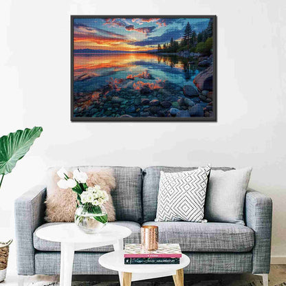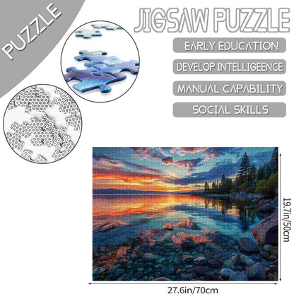 Les vagues lèchent doucement la côte rocheuse tandis que le soleil doré se fond dans le lac, projetant une palette saisissante d'orange, de bleu et de violet sur les eaux calmes. Les pins se détachent majestueusement à l'horizon, et les pierres lisses scintillent sous la surface transparente. Ce puzzle capture un moment paisible d'une soirée au bord d'un lac de montagne, vous invitant à la détente pièce par pièce.