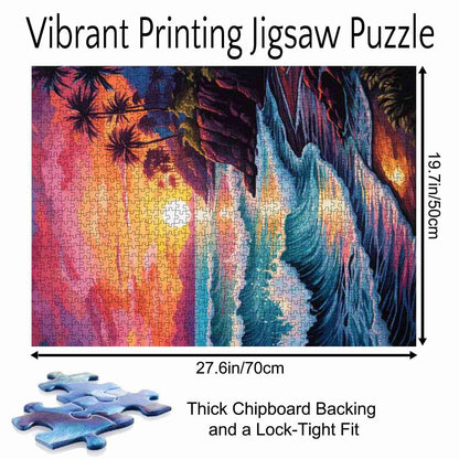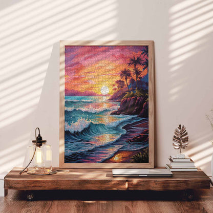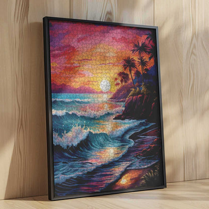 Des vagues cramoisies déferlent doucement vers un rivage rougeoyant tandis que le soleil se couche derrière des îles lointaines. Les palmiers ondulent le long des falaises escarpées, captant les dernières lueurs dorées du jour. Le ciel flamboie de nuances de rose, de violet et d'orange, se reflétant parfaitement sur le sable mouillé et la mer. Ce puzzle capture la magie tranquille d'une soirée tropicale : chaleureuse, paisible et pleine d'émerveillement. Chaque pièce est un pas de plus vers le paradis, où le temps ralentit et où la beauté s'étend à l'horizon.