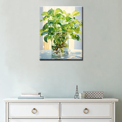 Feuilles vertes ensoleillées sur verre, peinture par numéros