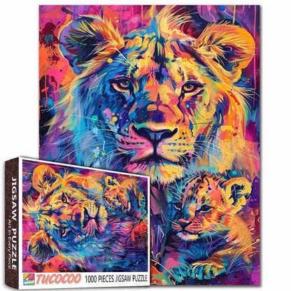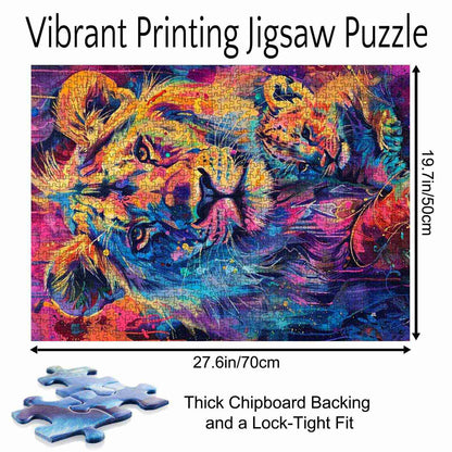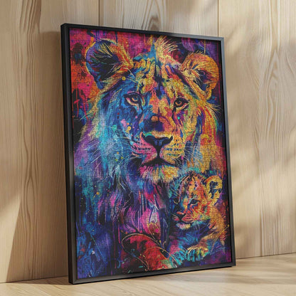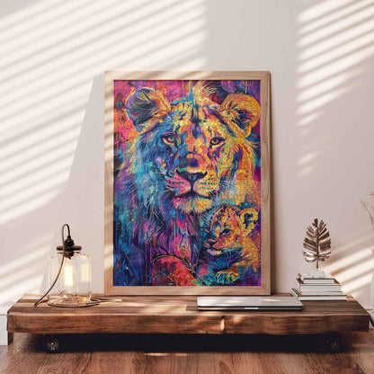 Ce superbe puzzle met en scène un lion puissant et son adorable lionceau, tous deux représentés par des touches de peinture vibrantes et colorées. Les couleurs vives de la crinière majestueuse du lion se marient aux teintes douces du lionceau, créant un contraste saisissant. L'arrière-plan déborde d'énergie, capturant l'essence même de cette magnifique famille animale. Parfait pour les amoureux des animaux et les amateurs de motifs artistiques et audacieux, ce puzzle offre un défi amusant et captivant.