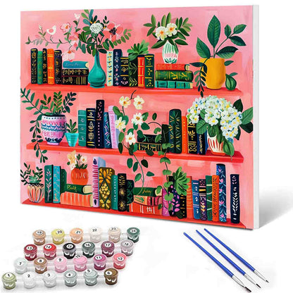 Donnez vie à votre espace avec cette peinture par numéros comprenant des étagères roses vives ornées de verdure luxuriante, de fleurs vibrantes et de livres élégants. Ce design charmant mélange nature et littérature, parfait pour se détendre et mettre en valeur votre décoration intérieure. Idéal pour les débutants et les amateurs d'art.