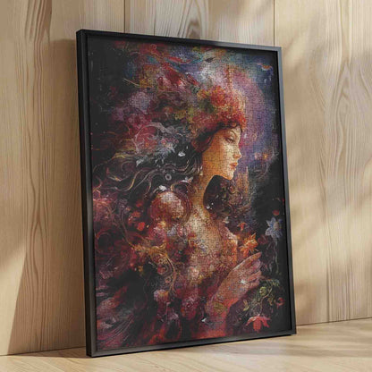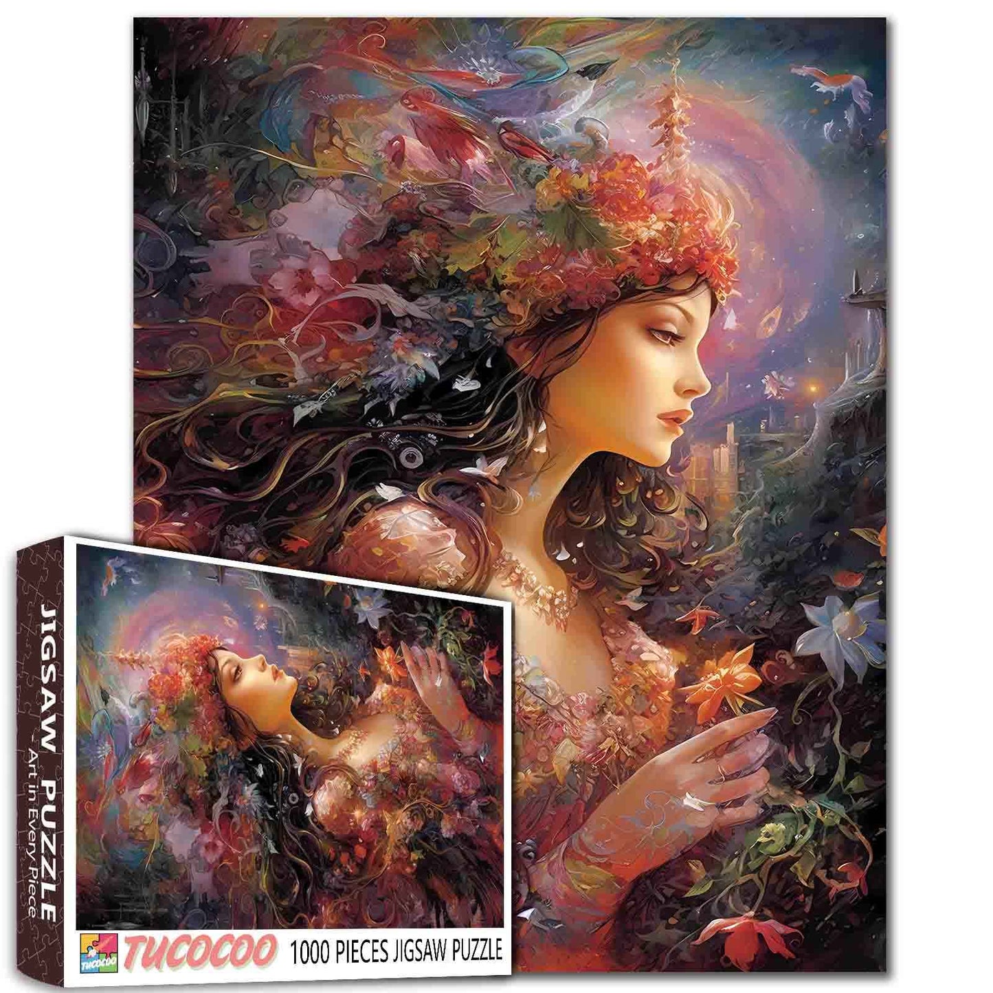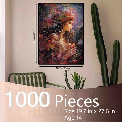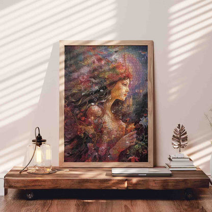 Au cœur d'une forêt enchantée, une fée à la chevelure tombante et couronnée de fleurs sauvages se tient silencieusement dans son reflet. Sa robe scintille du doux scintillement des pétales et de la rosée matinale, tandis que des feuilles colorées et des créatures cachées dansent autour d'elle dans l'ombre. Un silence magique enveloppe sa présence, comme si la forêt elle-même s'arrêtait pour l'écouter. Un puzzle fascinant qui capture l'âme de la nature.