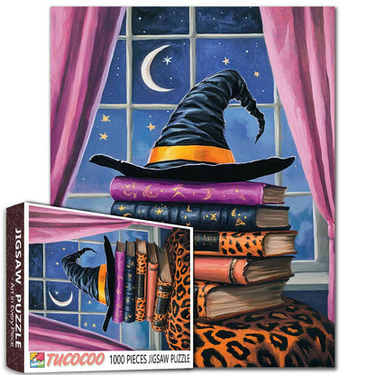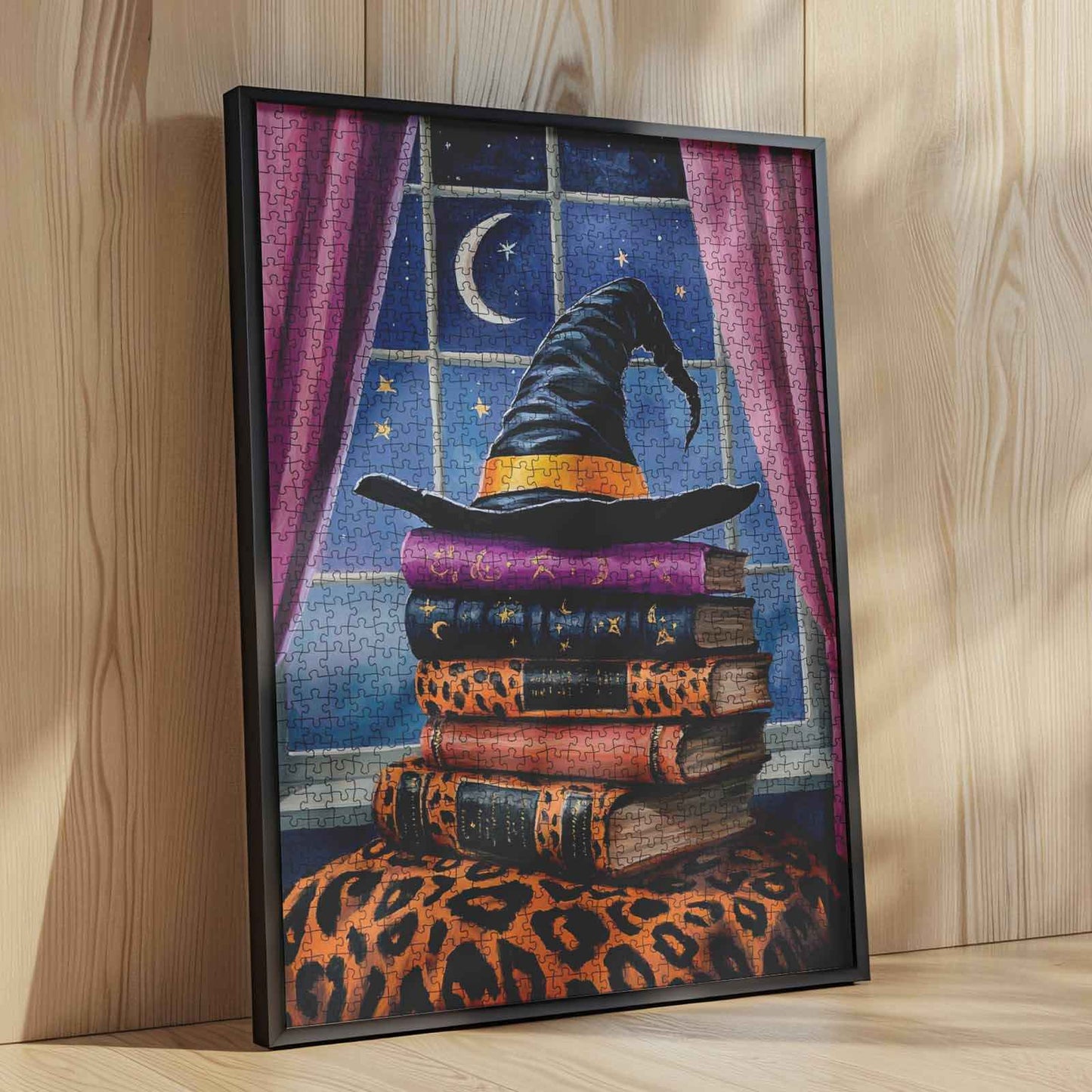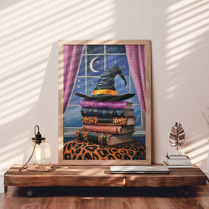 Un chapeau de sorcière tordu repose sur une pile colorée de grimoires, illuminés par le croissant de lune qui brille à travers la fenêtre. Des rideaux de velours encadrent la scène nocturne, projetant une douce lueur sur les tomes magiques reliés de motifs célestes étoilés et d'imprimés d'animaux sauvages. Les mystères de la nuit semblent prêts à jaillir des pages, chaque pièce reliée donnant vie à l'atmosphère fantaisiste, vous invitant dans un monde paisible de rêves, de sorts et de clair de lune.