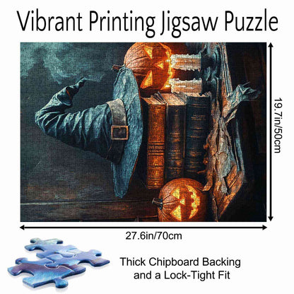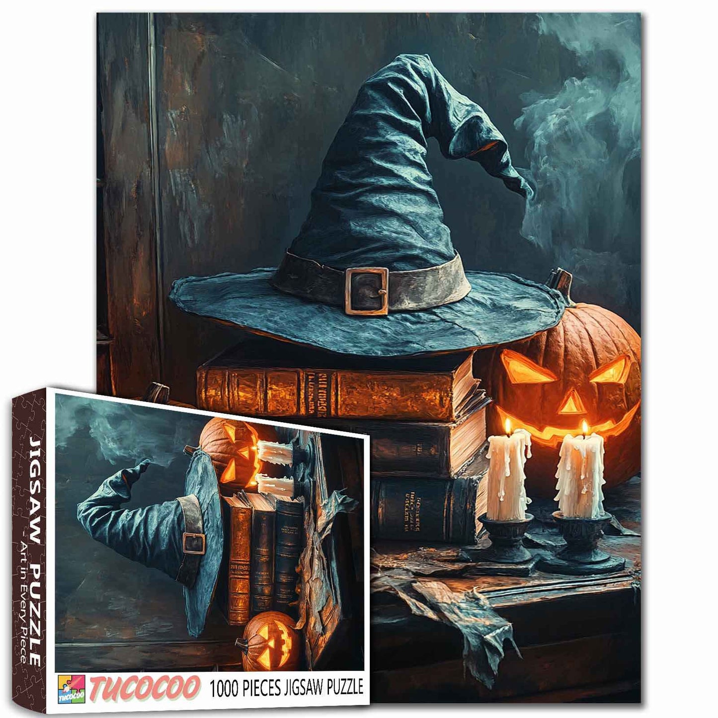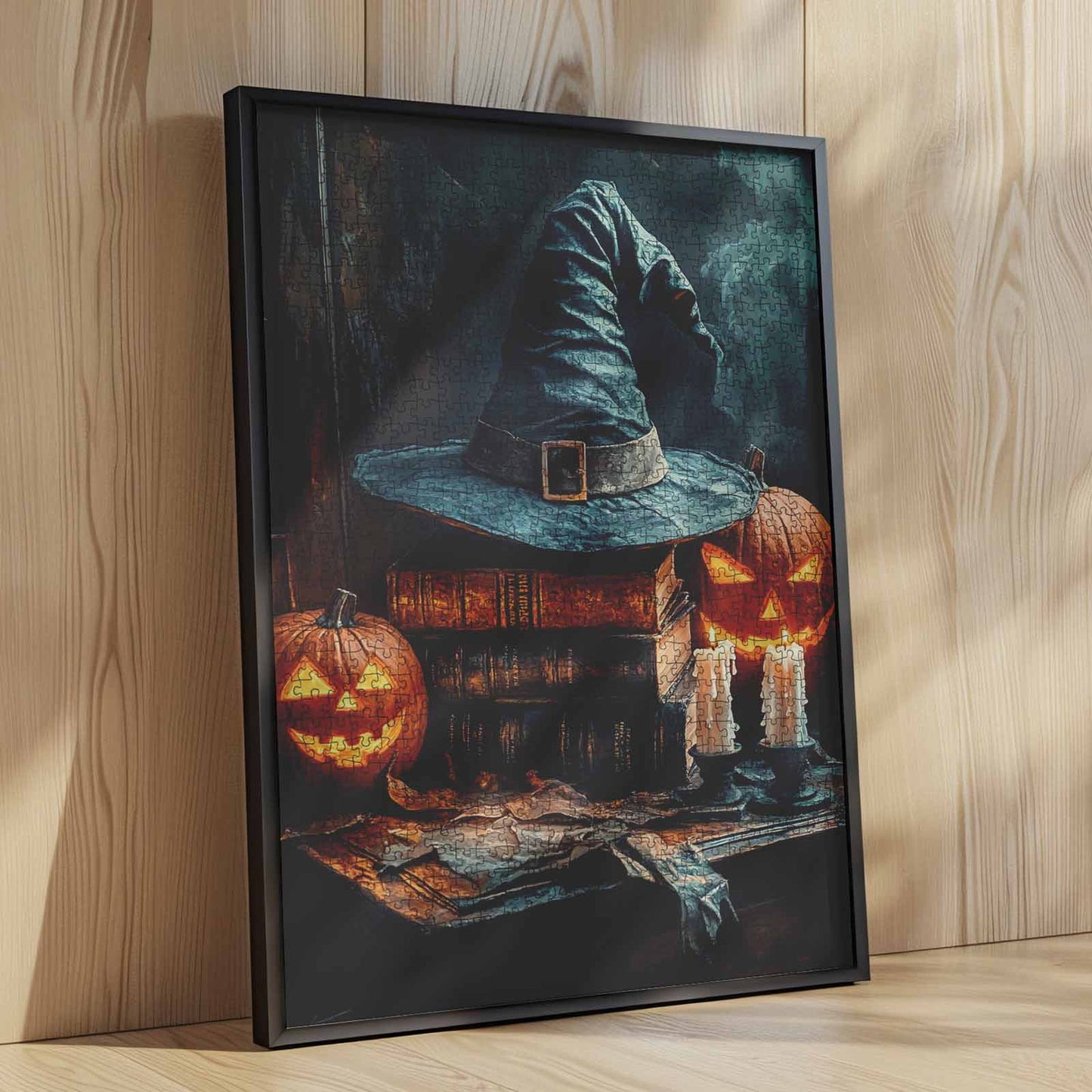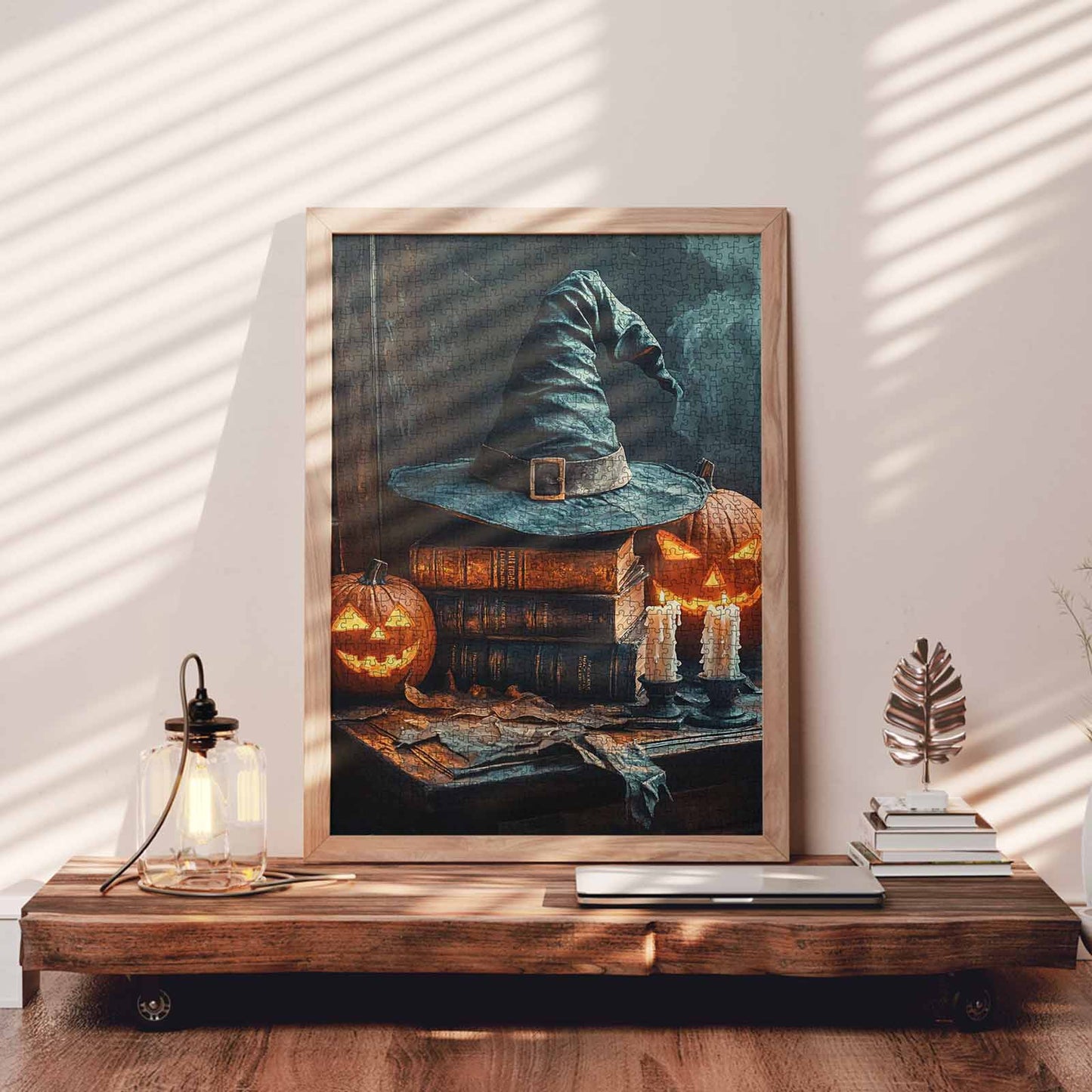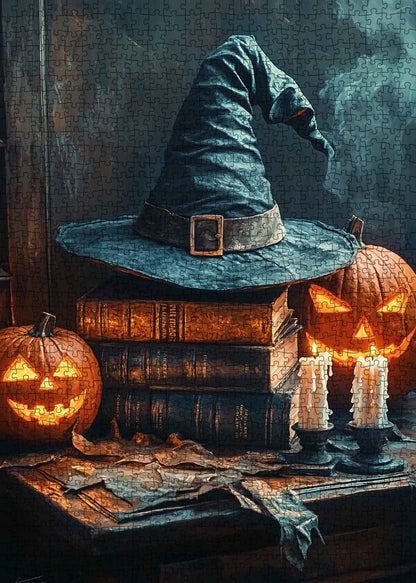 Sur une vieille table en bois, un chapeau de sorcière usé repose contre une pile de grimoires anciens, entouré de citrouilles-lanternes allumées et de bougies fondantes. Des volutes de fumée flottent dans l'air, transportant un parfum d'automne et de mystère. Chaque pièce du puzzle donne vie à cette scène d'Halloween à la fois chaleureuse et inquiétante, où sorts oubliés et histoires secrètes semblent prêtes à se dévoiler. Un voyage parfait dans un monde où la magie persiste sous la douce lueur des bougies.
