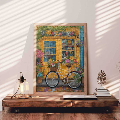 Une devanture jaune et gaie déborde de fleurs : jardinières et paniers débordant de marguerites, de tournesols et de fleurs sauvages. Un vélo blanc classique est garé devant, son panier en osier débordant de fleurs fraîchement coupées. Derrière la vitre, des cadres et des livres apparaissent, laissant entrevoir les histoires qui vous attendent. Le carrelage coloré sous les pieds et le lierre qui tombe en cascade complètent le tableau d'un après-midi paisible et parfait. Chaque objet posé vous plonge dans un rêve de petite ville baigné de soleil et de sérénité.