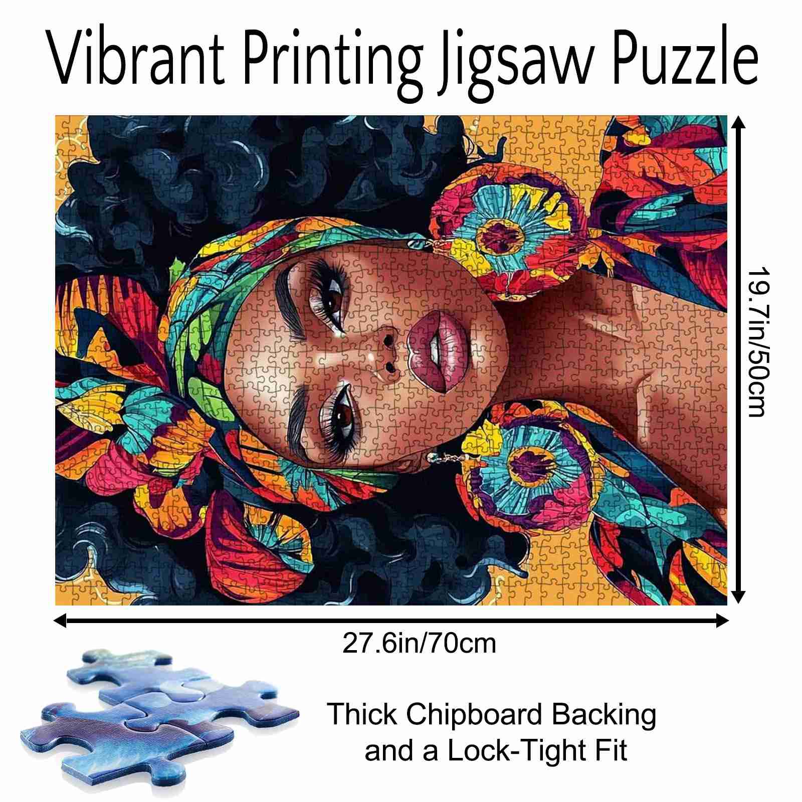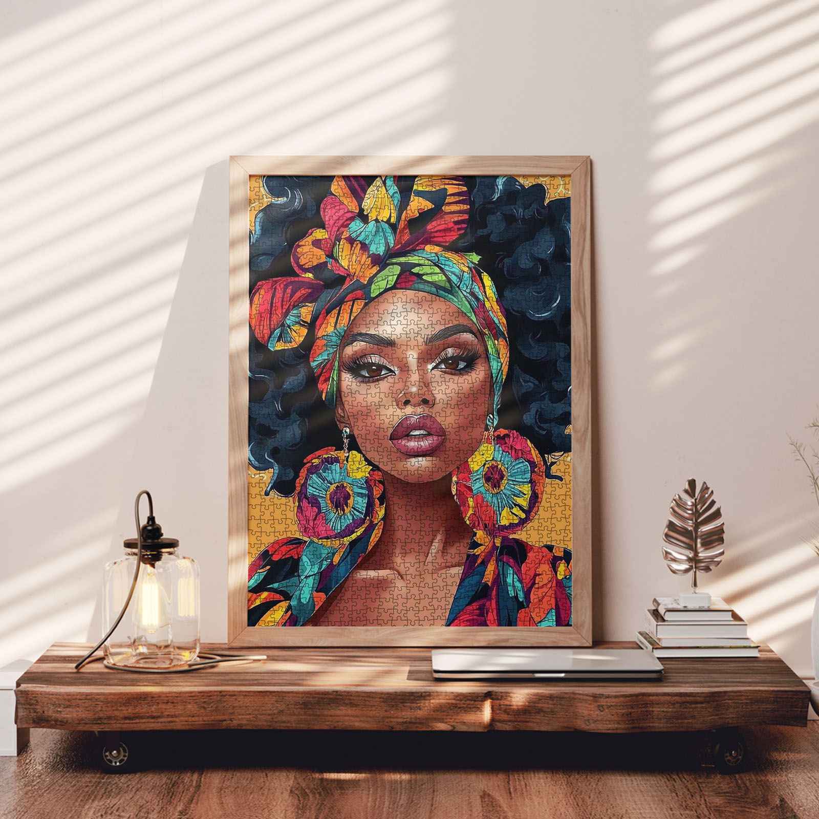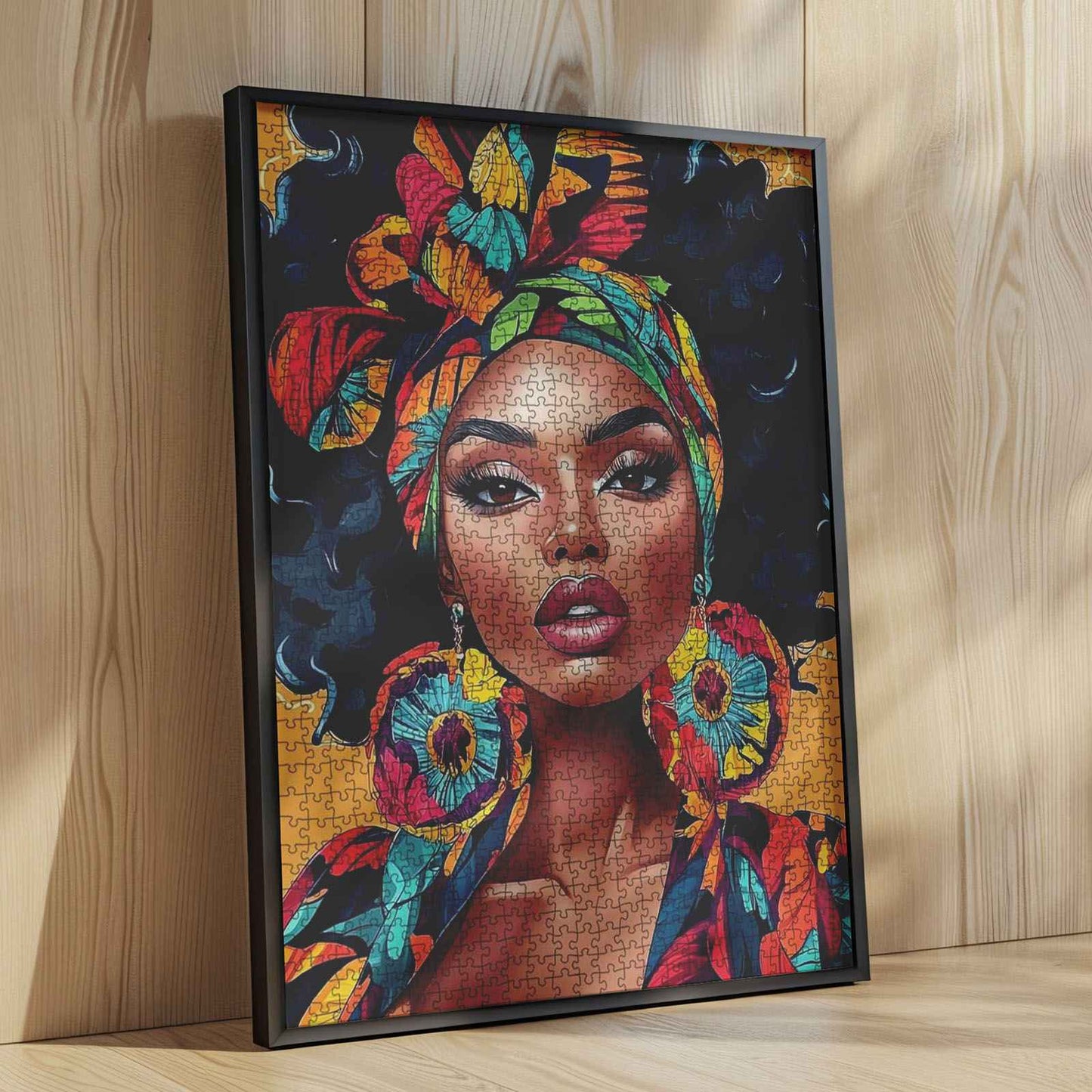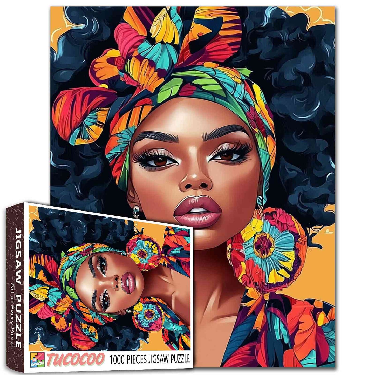 A striking portrait of confidence and culture, this puzzle showcases a stunning woman adorned in a vividly patterned headwrap and oversized earrings. Her gaze is fierce, her presence commanding, embodying strength and elegance. Each piece connects you to a world of bold fashion and artistic expression, making this an eye-catching addition to your collection.