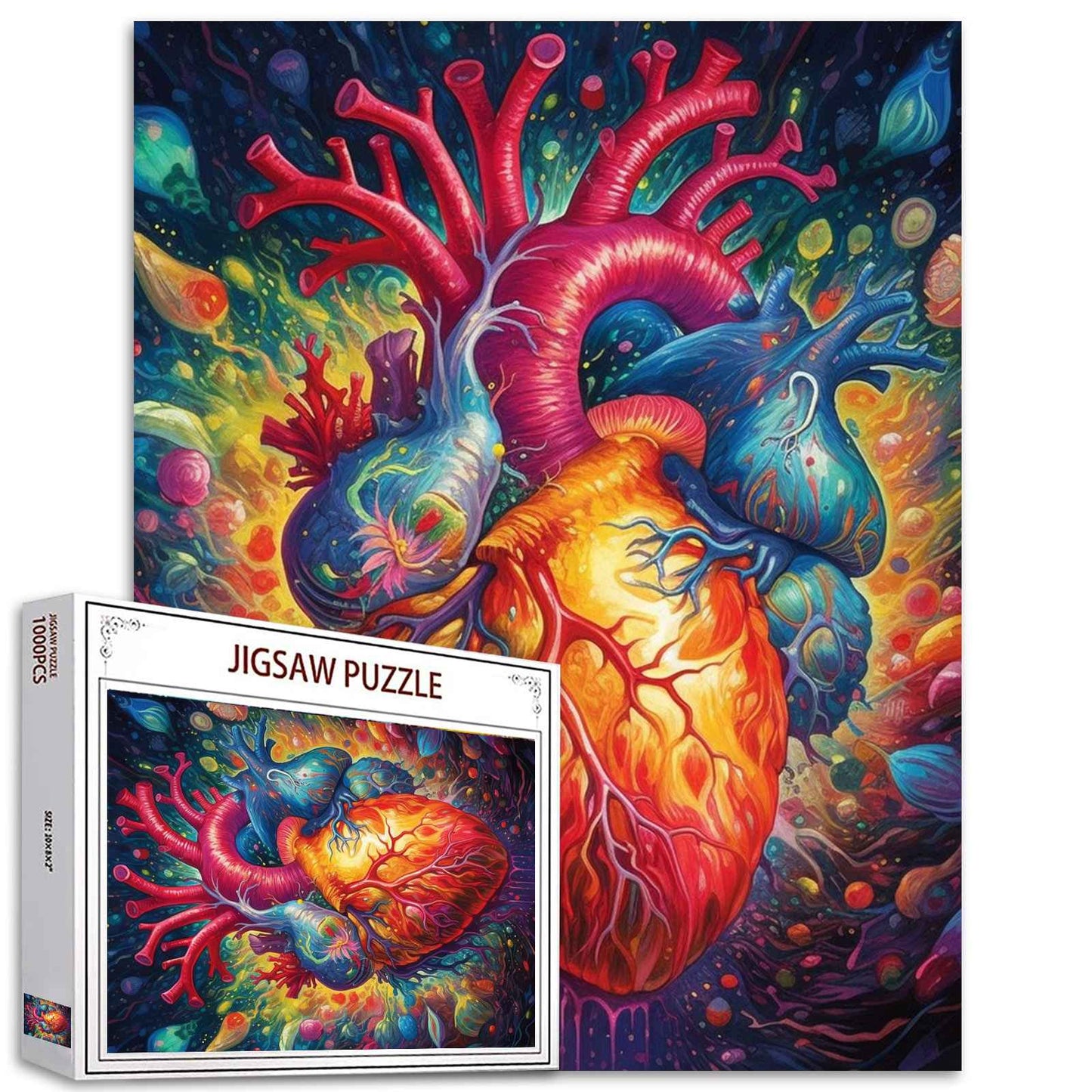 This jigsaw puzzle features a vibrant anatomical heart bursting with radiant colors and intricate details. Each vein and artery is highlighted in rich, vivid tones, creating a masterpiece that celebrates both science and art. The swirling background adds depth and energy, making this puzzle not only a challenge but a stunning piece of decor once completed. A perfect choice for anatomy enthusiasts, art lovers, or anyone seeking a meaningful and engaging activity.