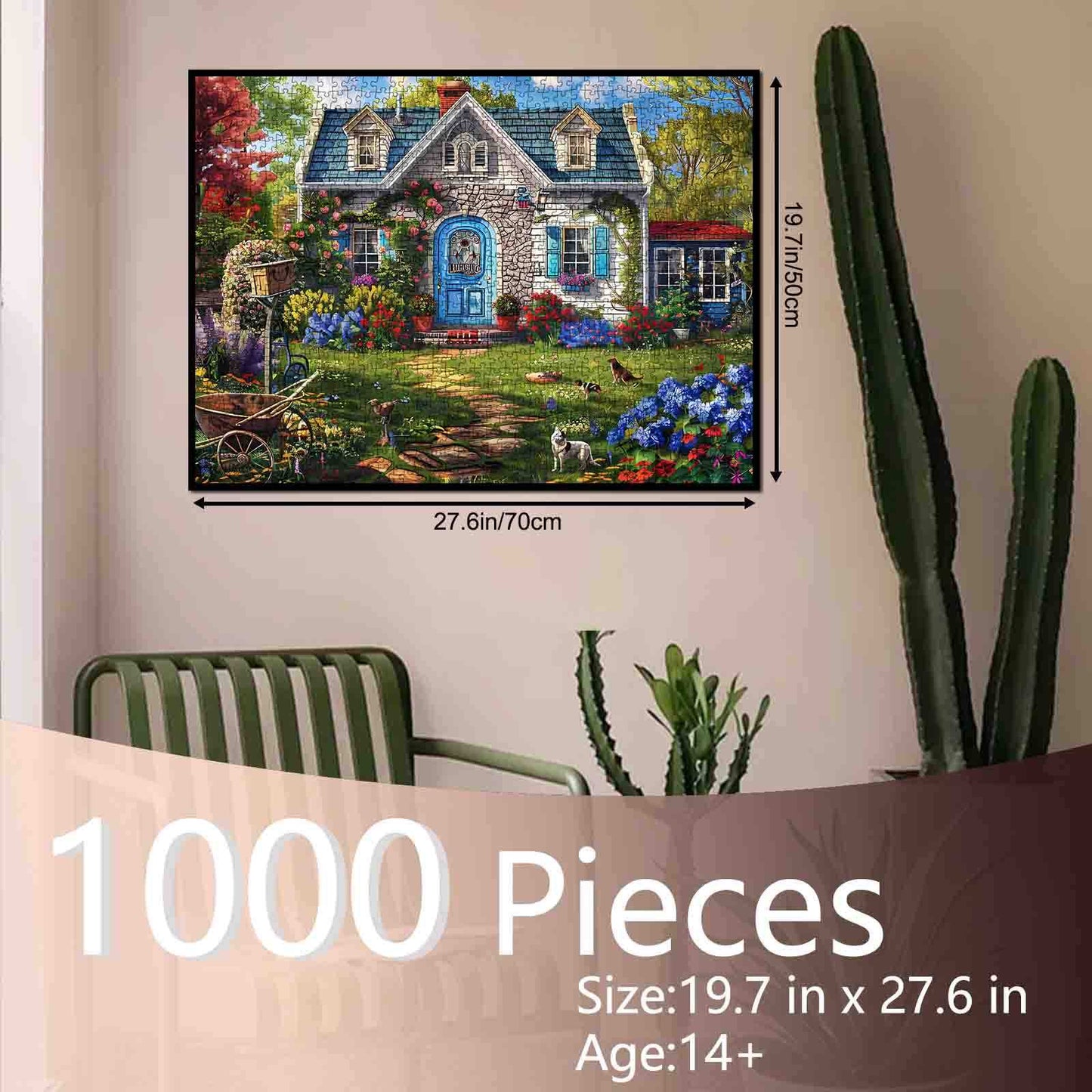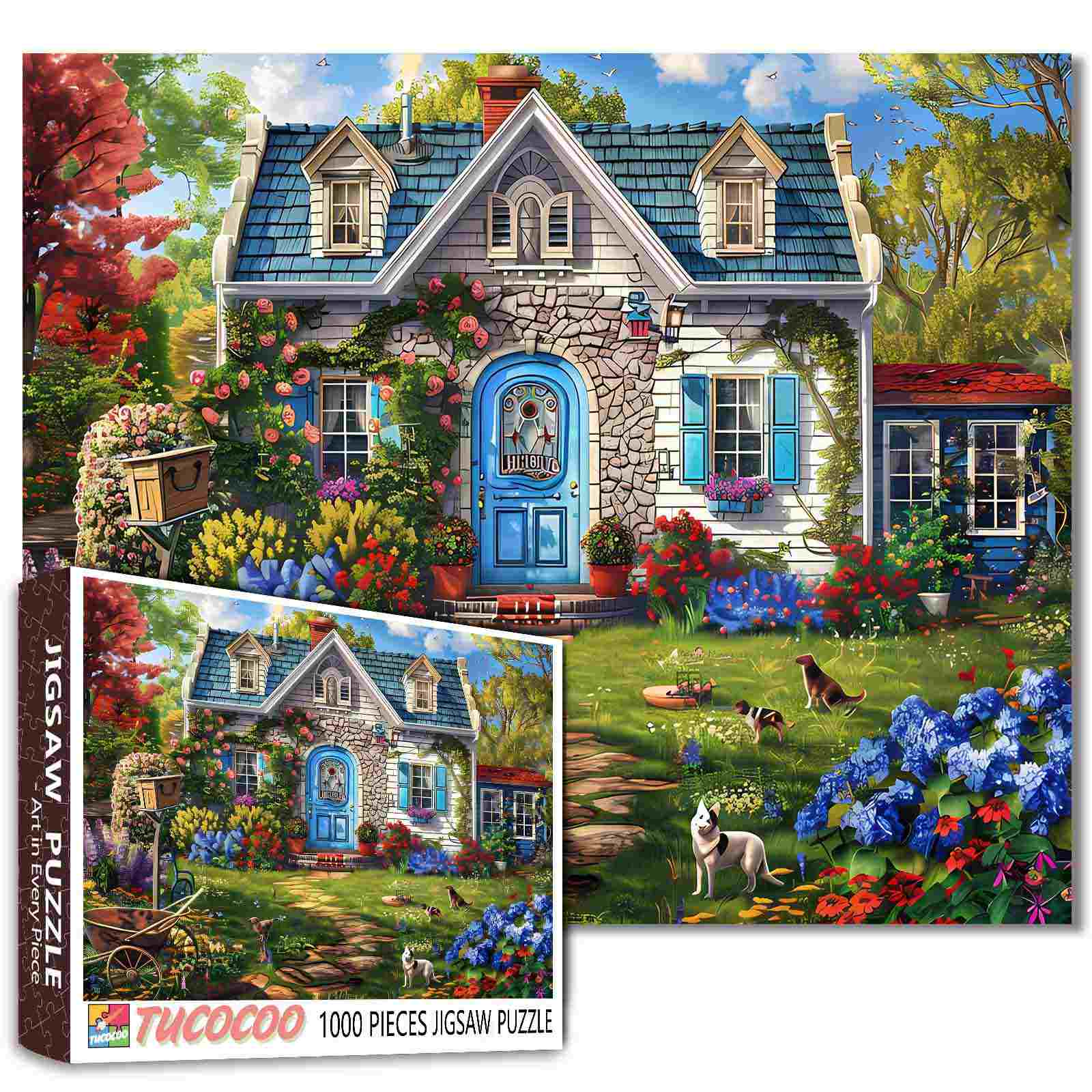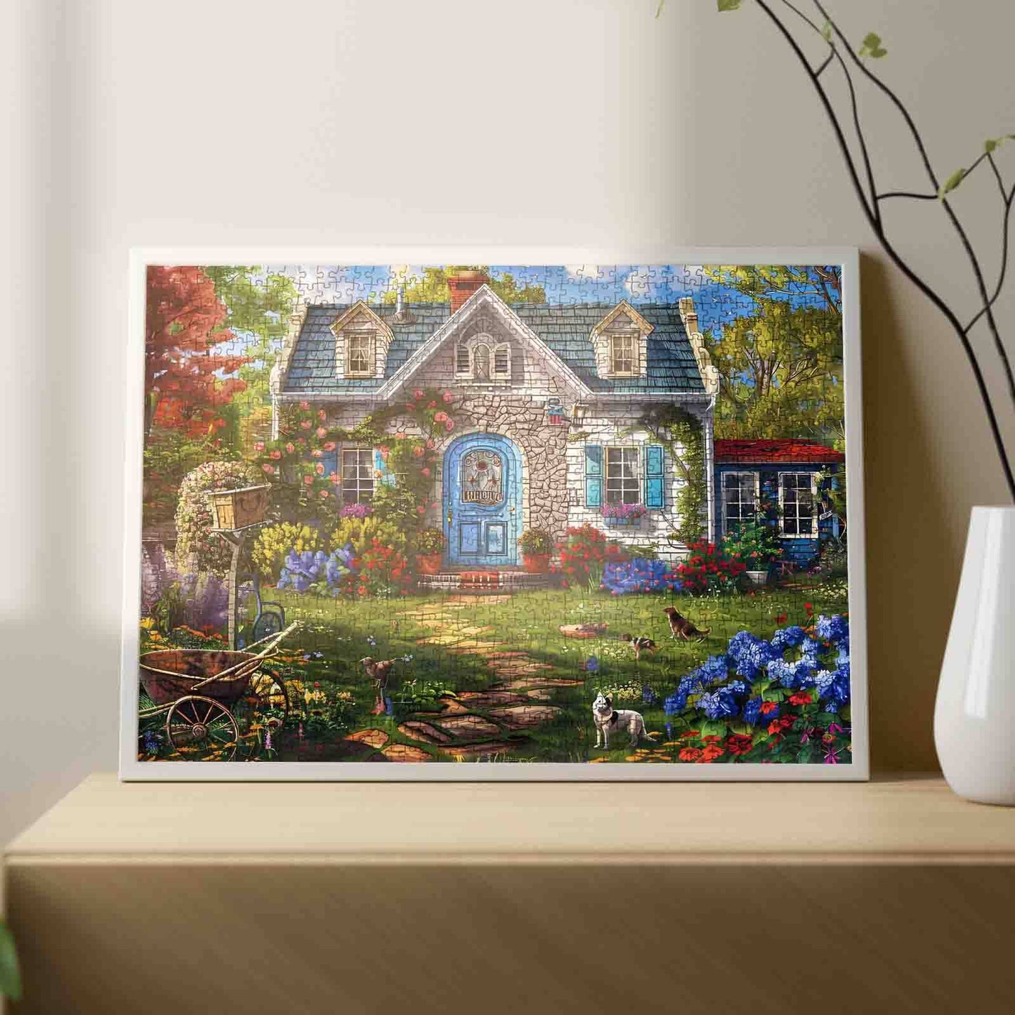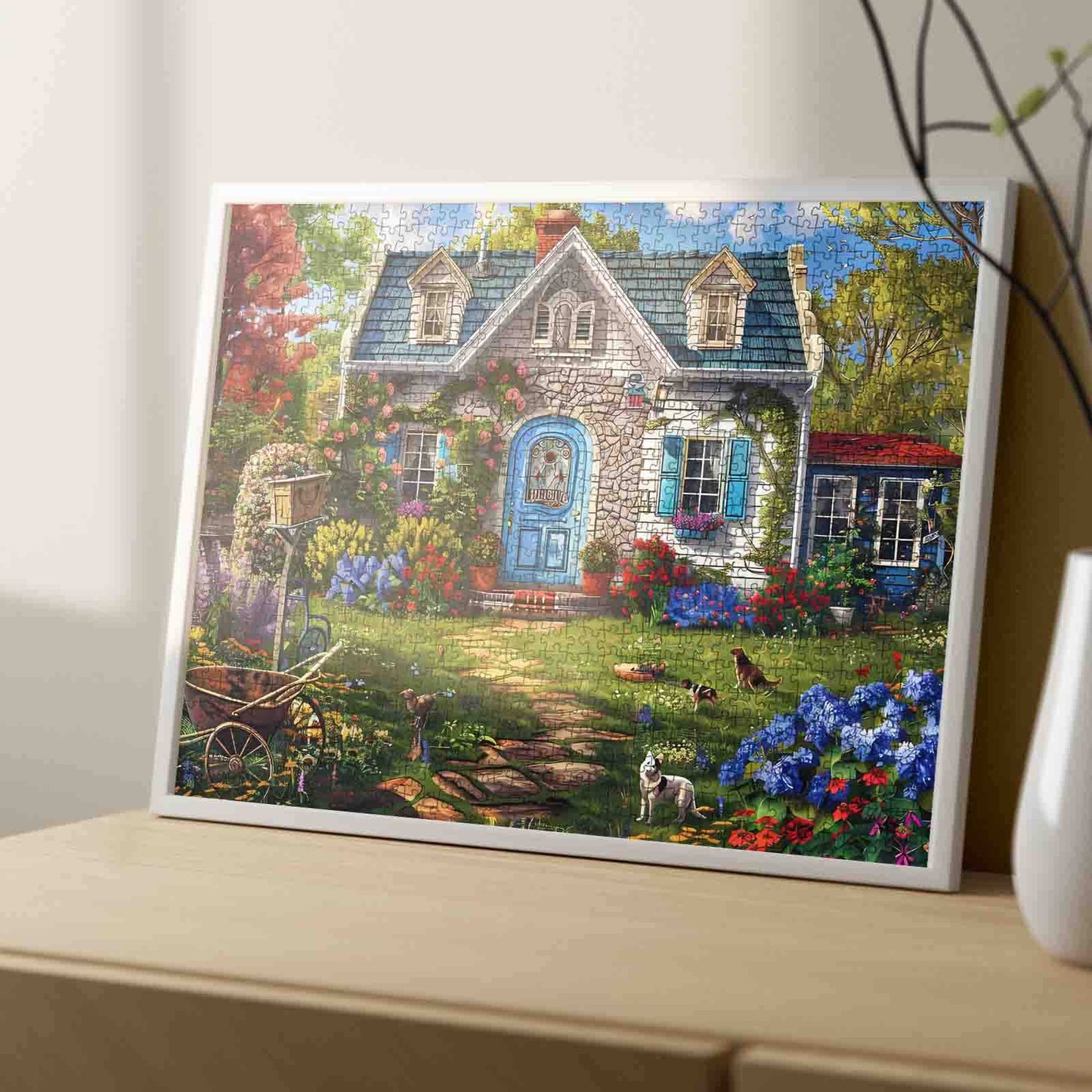 Sunlight pours onto a cottage with a striking blue door, nestled among blooming roses, hydrangeas, and vivid green shrubs. A cobbled path leads visitors through the garden, where curious dogs and birds add joyful life to the peaceful front yard. Blue shutters, red bricks, and a red-roofed sidehouse complete the fairytale charm. It's a picture of calm mornings and slow living, captured in puzzle form.
