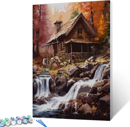 Step into a serene forest scene with this Paint by Numbers kit, capturing a rustic cabin nestled among vibrant autumn trees and a gentle waterfall. The calming flow of water and warm colors make this an inviting project for both beginners and experienced artists, adding a touch of woodland charm to any decor.