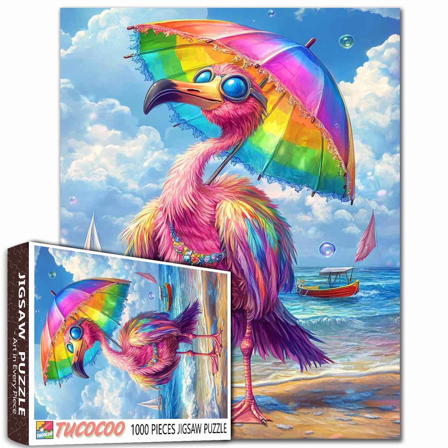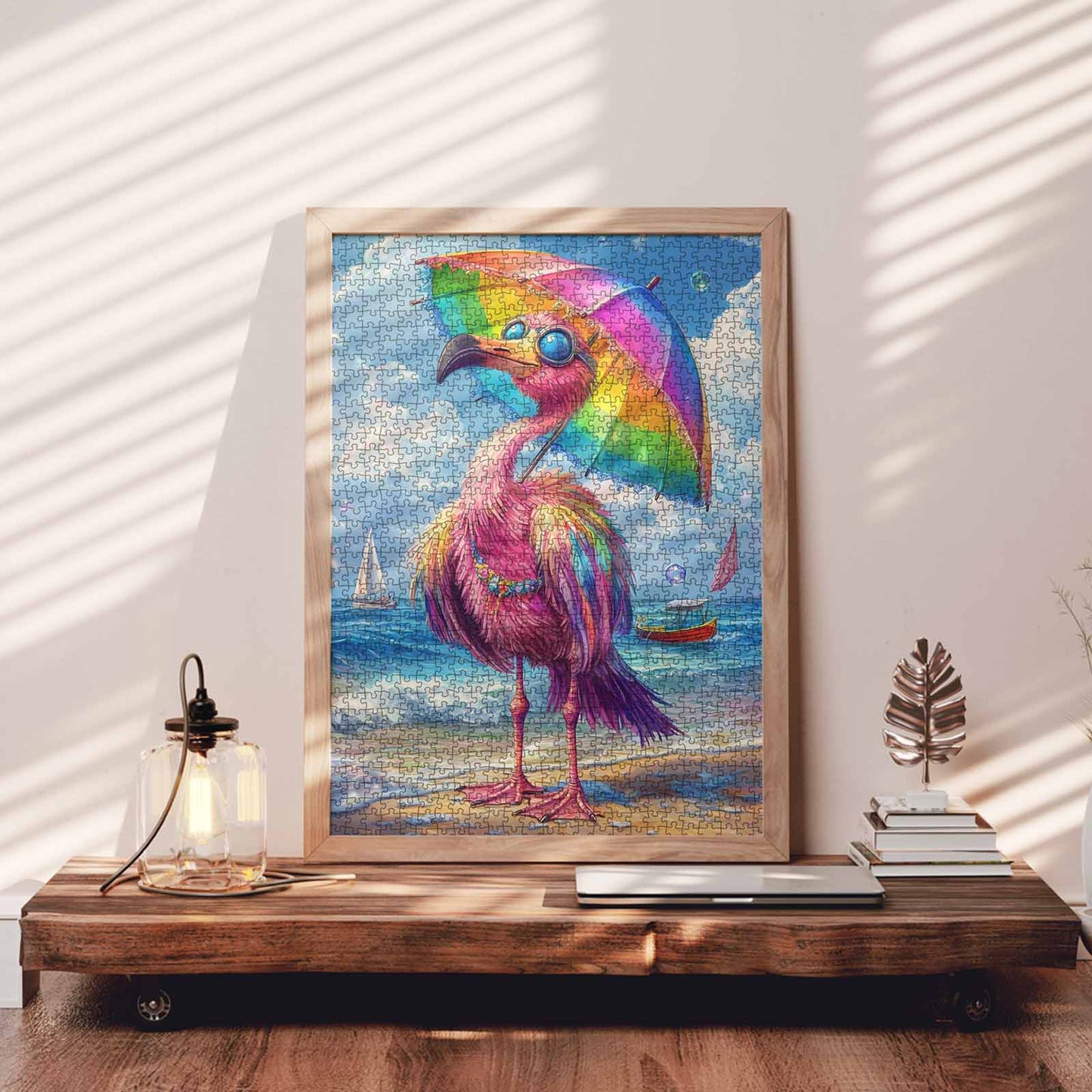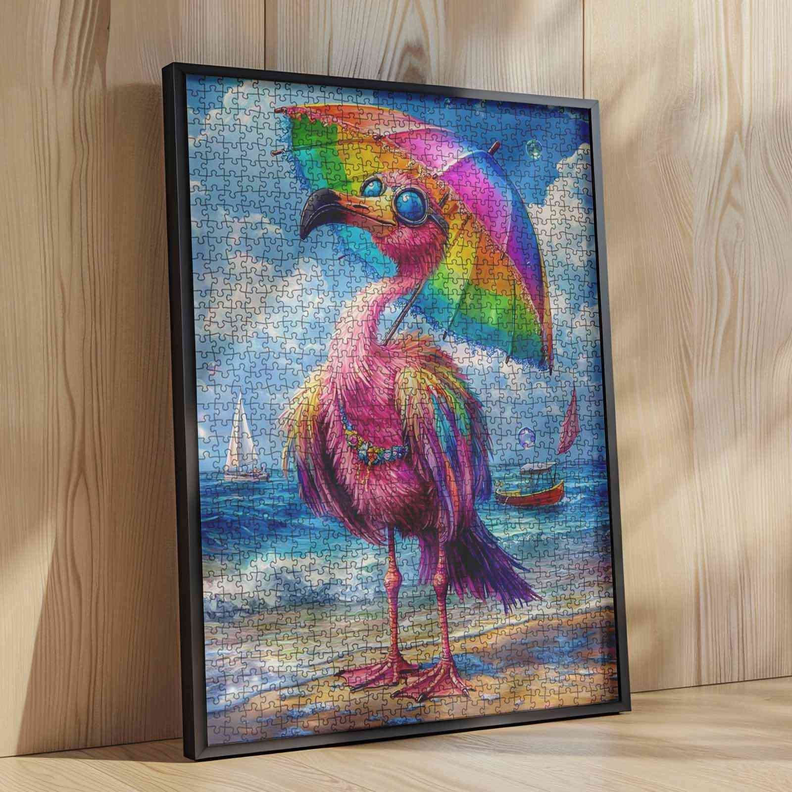 This vibrant flamingo stands proudly under a rainbow-colored umbrella, sporting stylish sunglasses and a colorful necklace. Set against a sunny beach backdrop with gentle waves, the flamingo's rainbow-colored feathers add a playful touch to the scene. The bright colors and whimsical details of this puzzle create a fun and relaxing challenge. Perfect for bird lovers and fans of vibrant art, this puzzle offers a cheerful and creative experience.