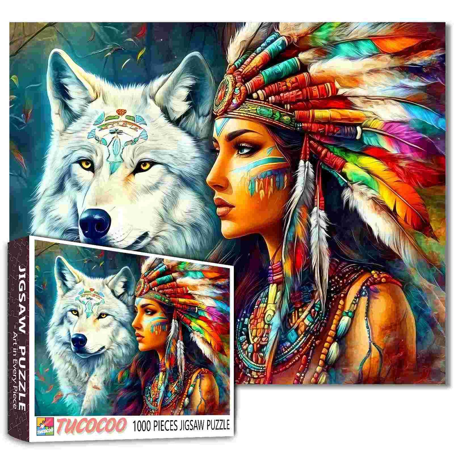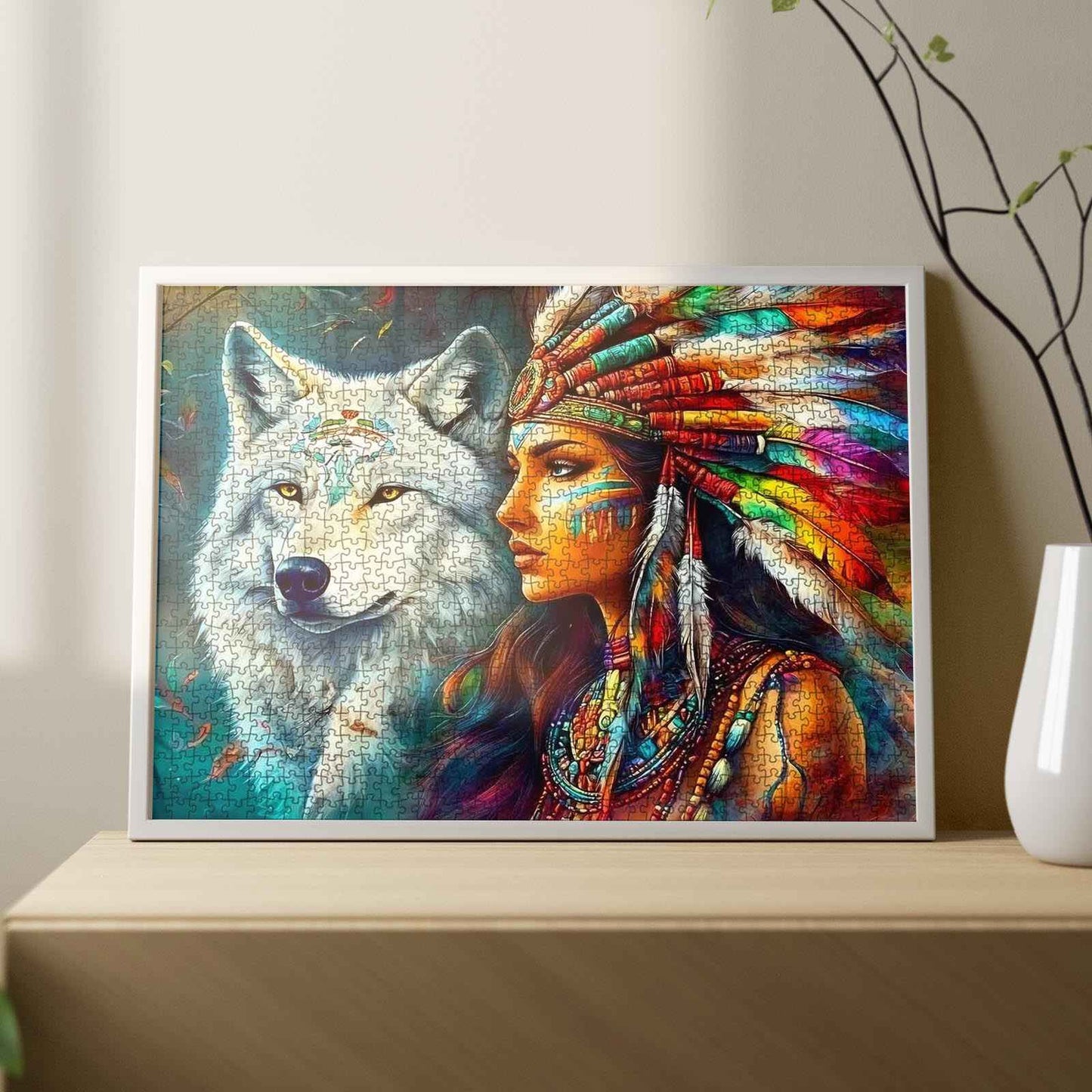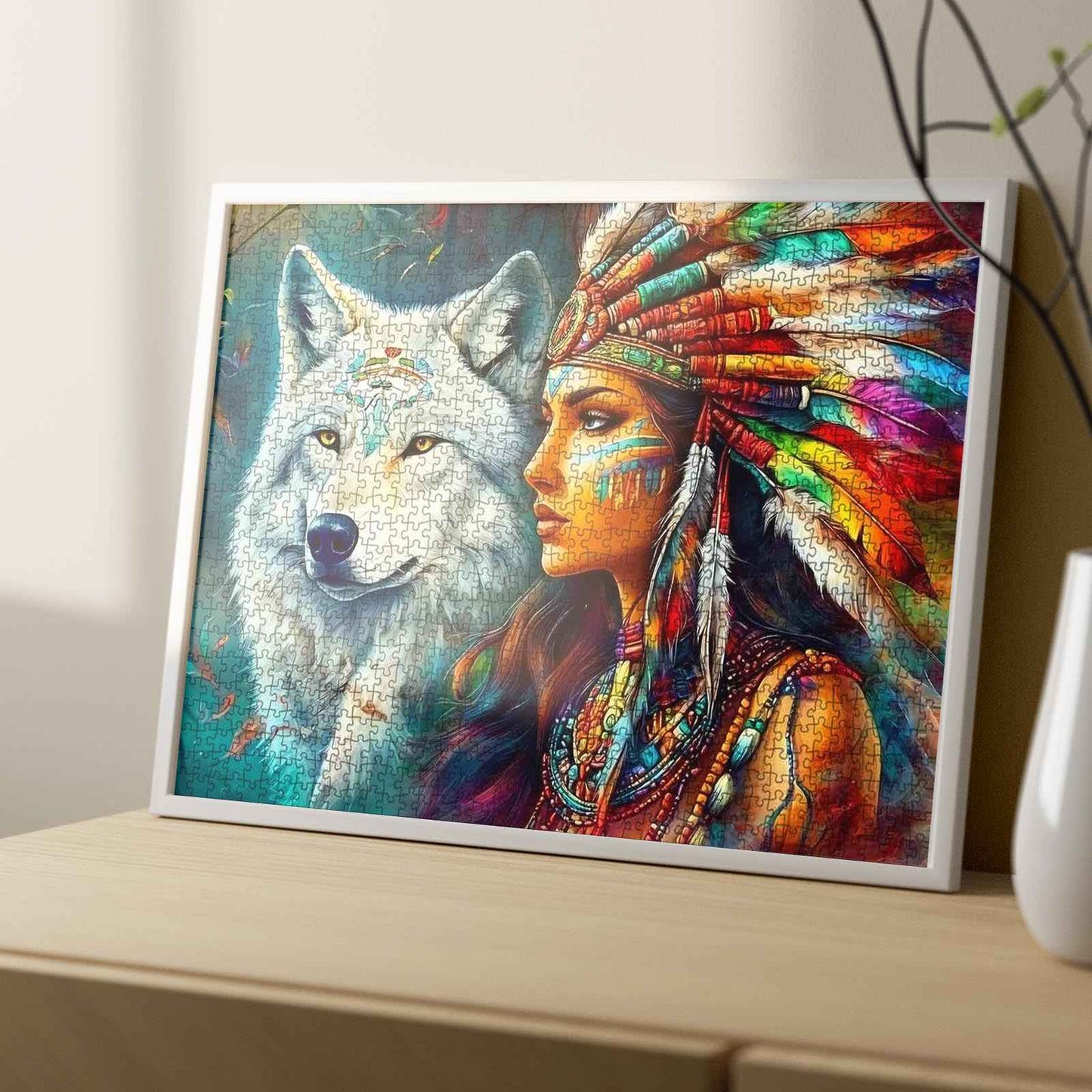 Journey into the heart of tradition with our Native Spirit and Wolf Jigsaw Puzzle. This evocative 1000-piece puzzle captures a Native American woman in close companionship with a noble wolf, both embellished with rich tribal motifs. The intense gaze of the wolf paired with the serene expression of the woman creates a compelling contrast, reflecting the harmony and resilience of indigenous cultures. Ideal for those who appreciate cultural depth and the wild's allure, this puzzle offers an enriching assembly experience.