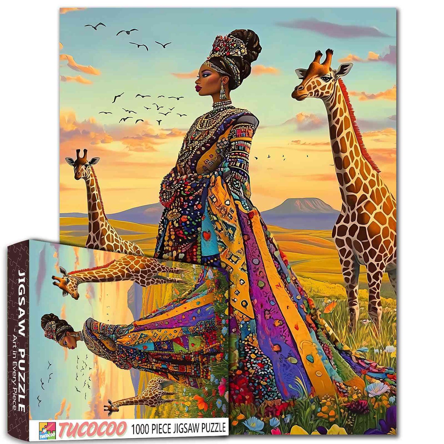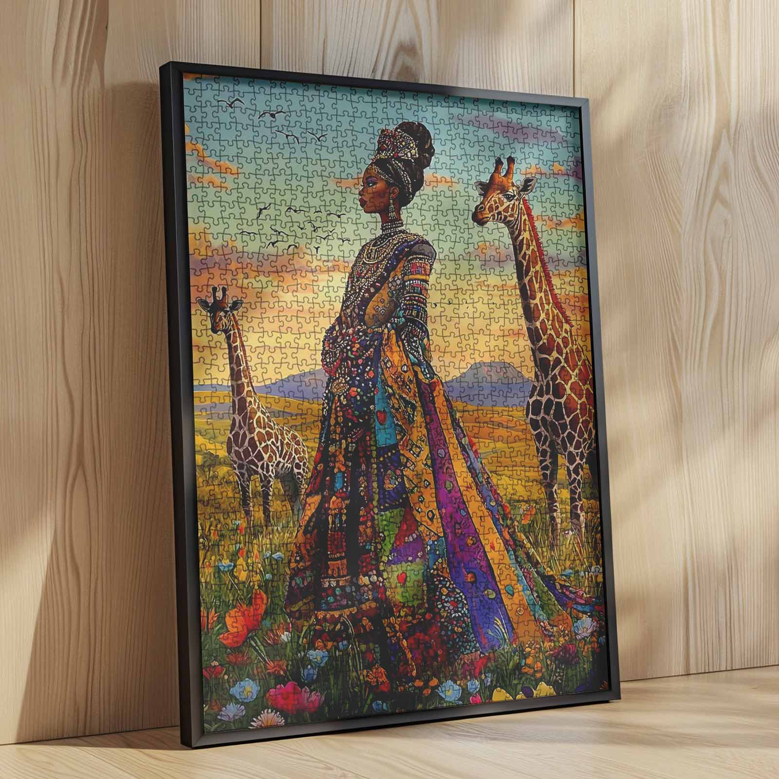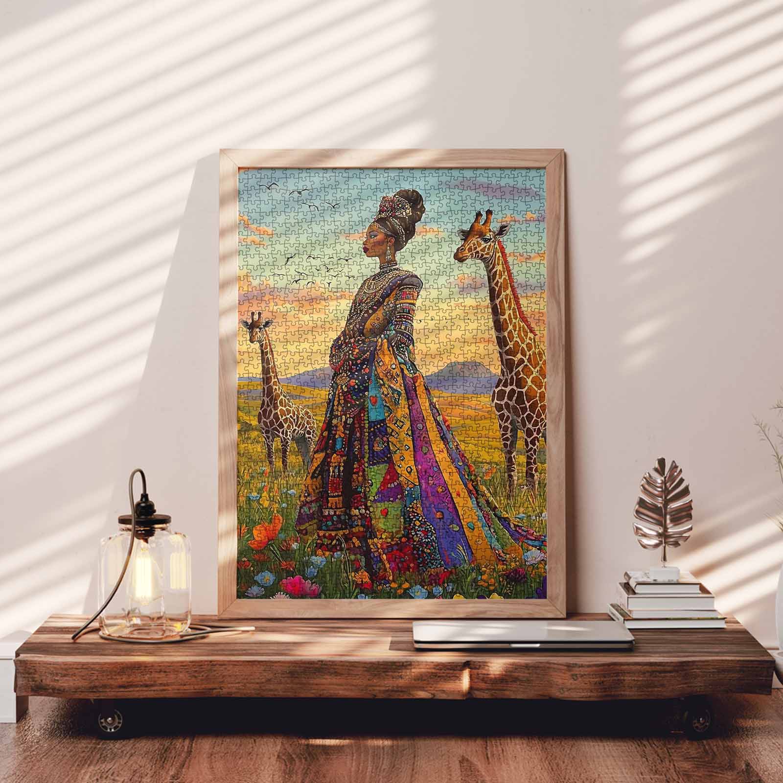 Step into the vibrant beauty of the savannah with this stunning jigsaw puzzle. Featuring a regal woman dressed in a kaleidoscope of colorful patterns, adorned with intricate jewelry, she stands gracefully among giraffes under a serene sky. The rich details and warm tones celebrate the harmony between elegance and nature, making this puzzle an artistic and captivating experience.
