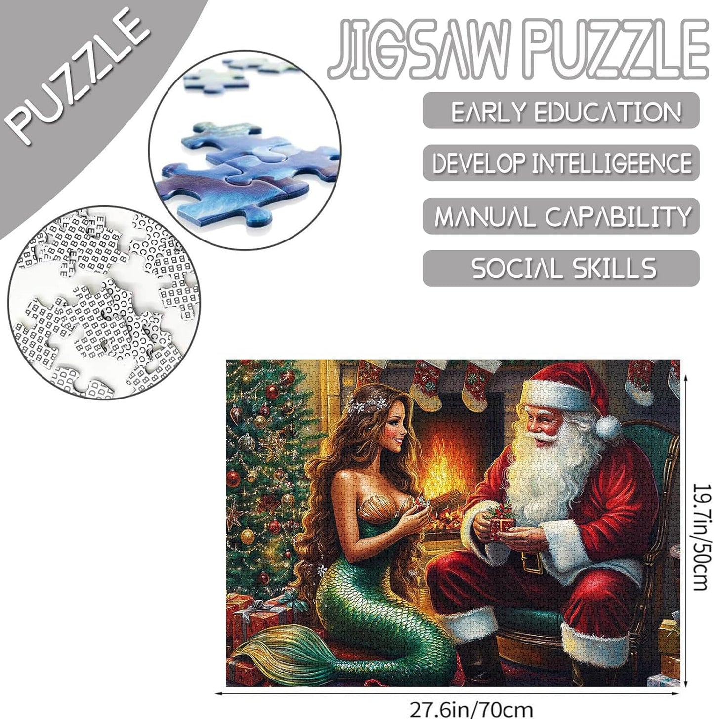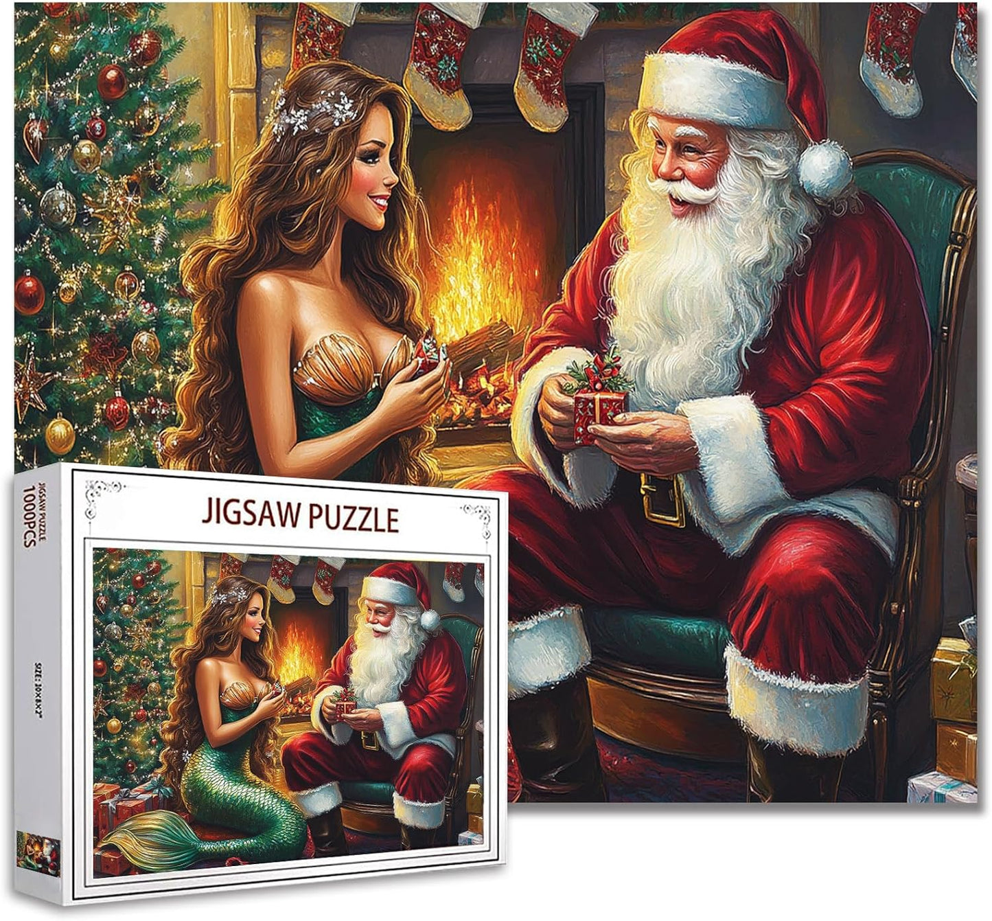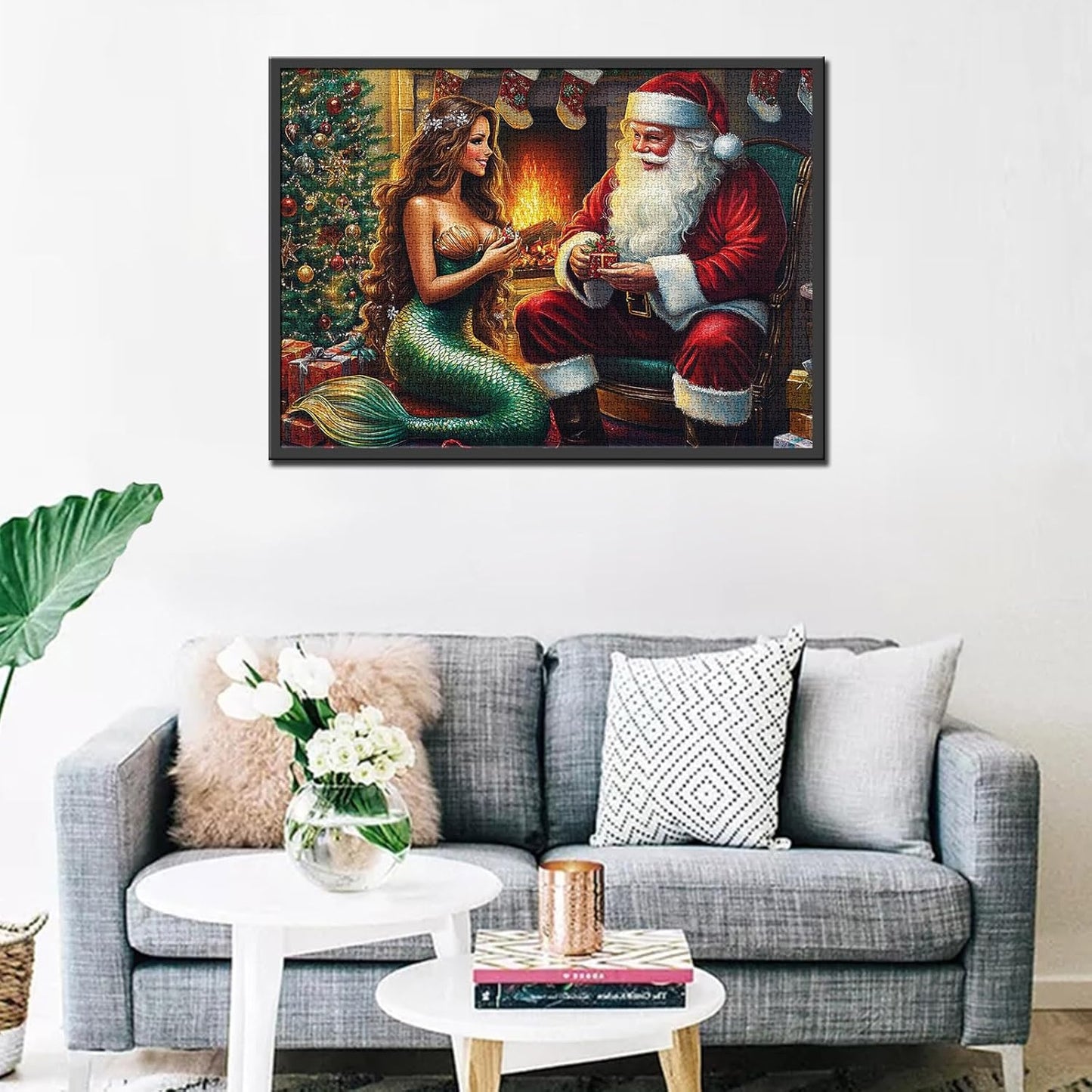 - This festive jigsaw puzzle features a beautiful mermaid sitting by a crackling fireplace, receiving a gift from Santa Claus. The scene is full of Christmas cheer, with a decorated Christmas tree and stockings hung by the fireplace. The puzzle is perfect for adding a touch of holiday magic to your home.