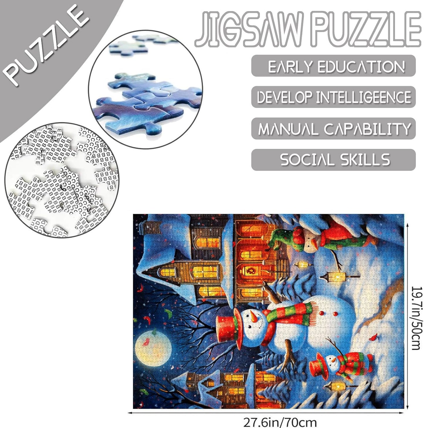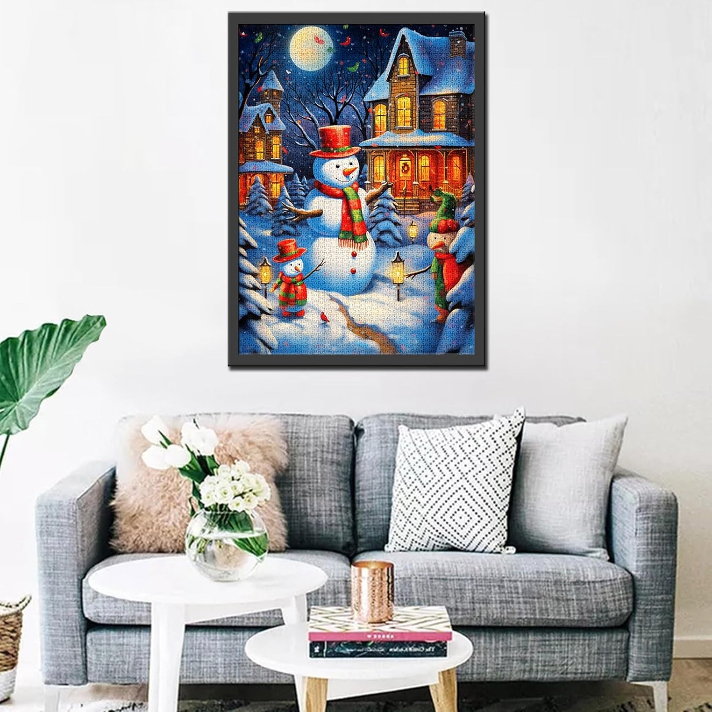 - This charming Christmas scene features a jolly snowman with a top hat and scarf, surrounded by his snowman friends. Snow falls gently as the moon shines brightly on a quaint village with glowing windows. This festive jigsaw puzzle is sure to bring holiday cheer to your home.