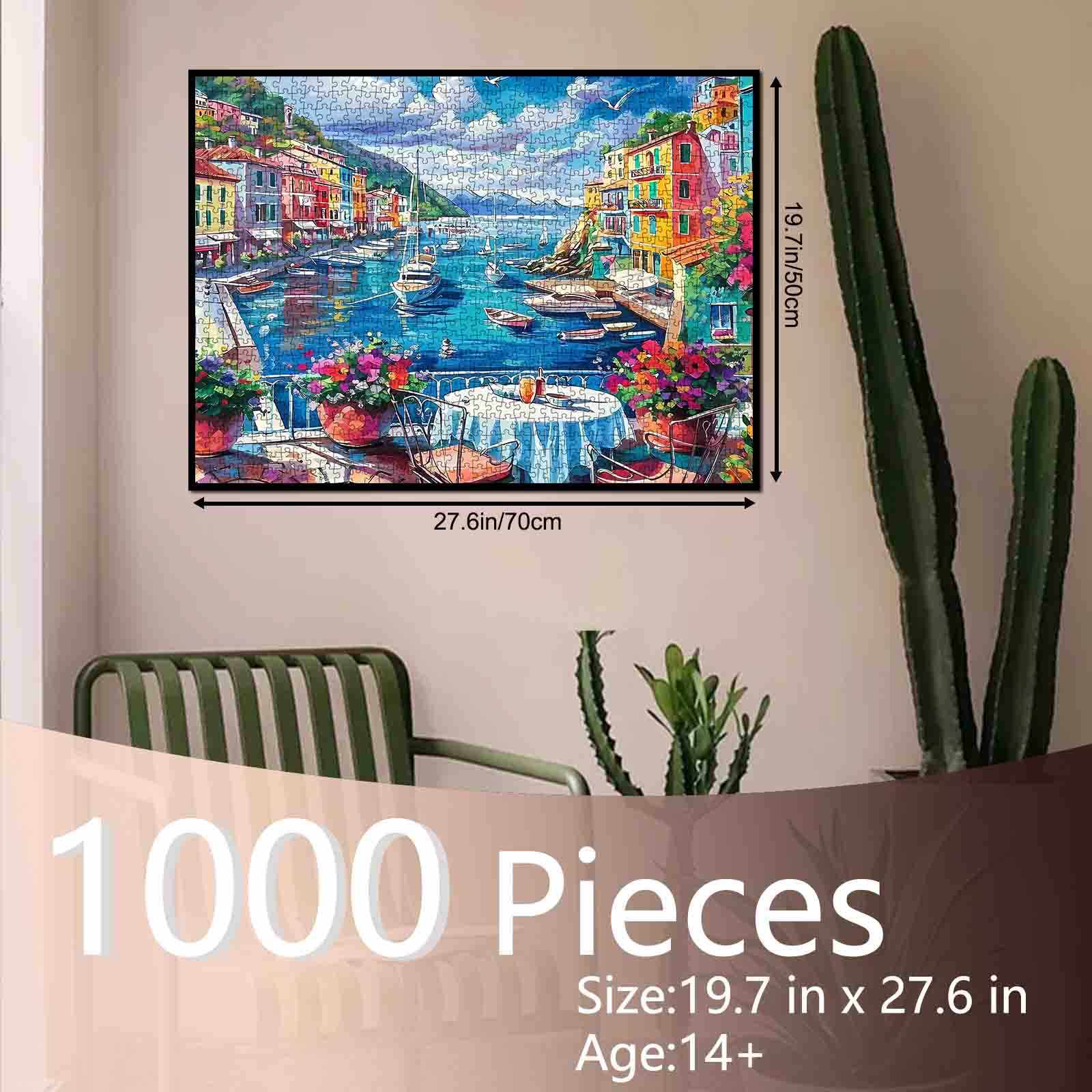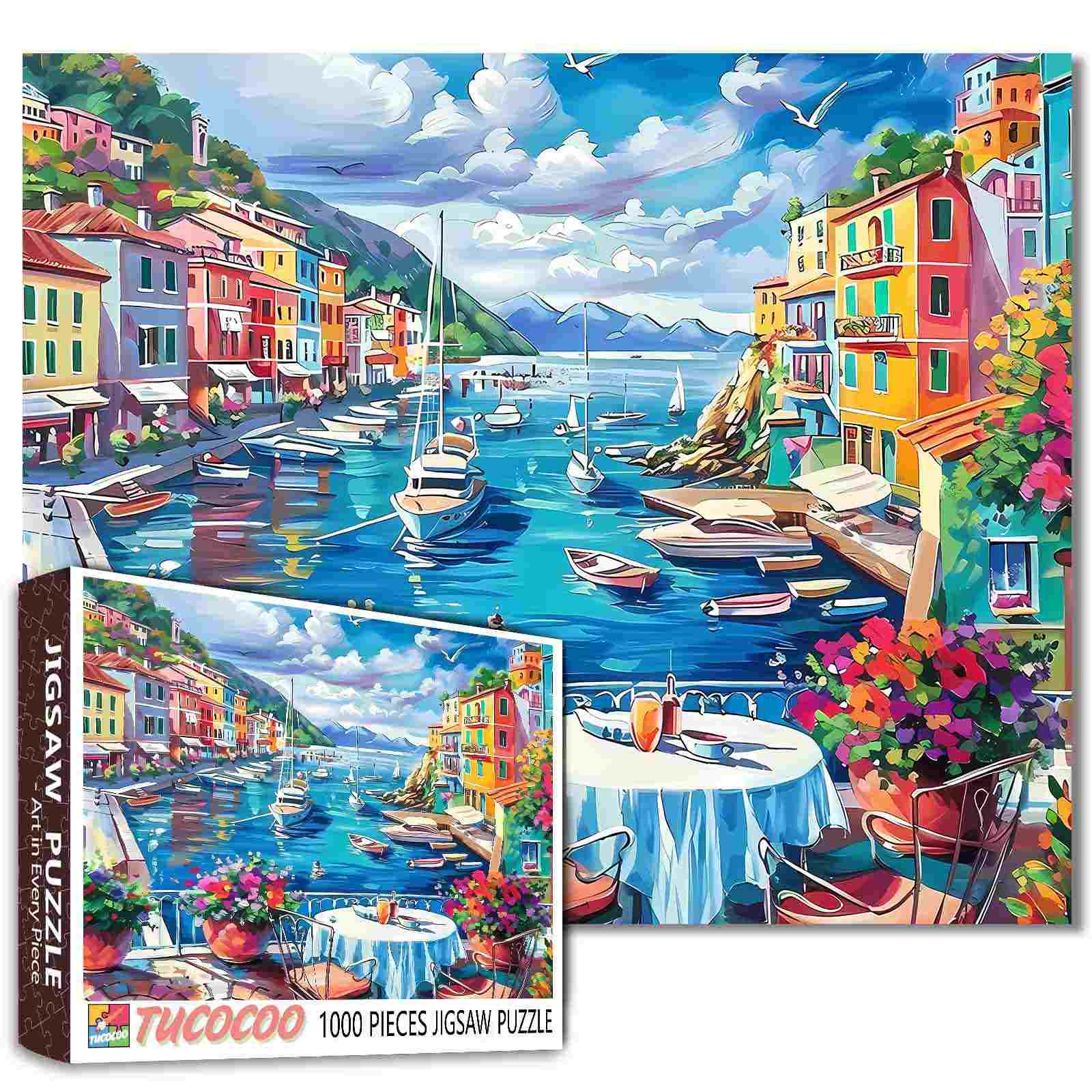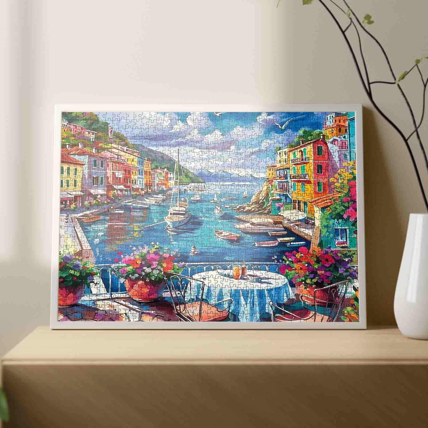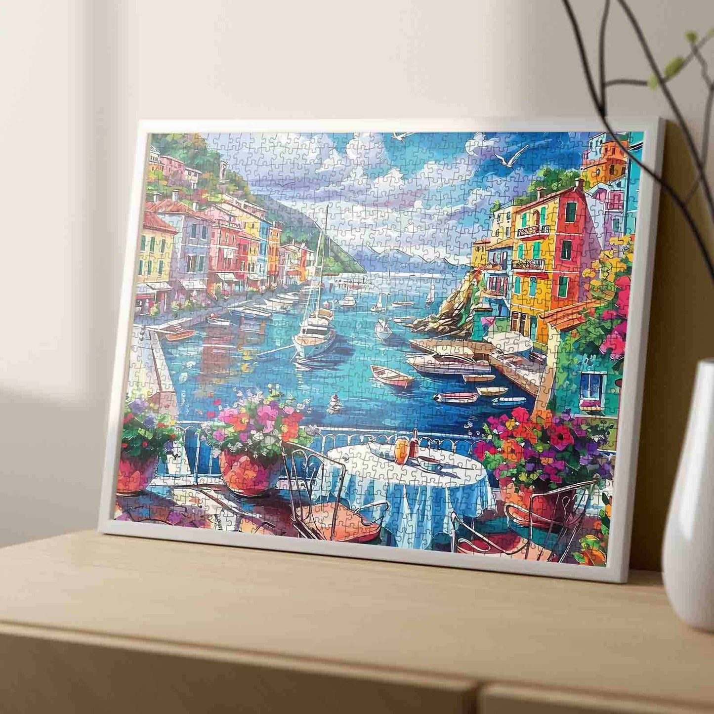 Sunlight dances on the harbor, where sailboats rest gently in a sea of blue and bright houses climb the hillside in a rainbow of colors. A small seaside café waits quietly in the foreground, its table set with wine and flowers, offering a view that seems to slow time. The air carries a hint of salt and blooming petals, and seagulls float across the sky like moving brushstrokes. Completing this puzzle is like stepping into a Mediterranean summer afternoon, full of warmth and peaceful rhythm.