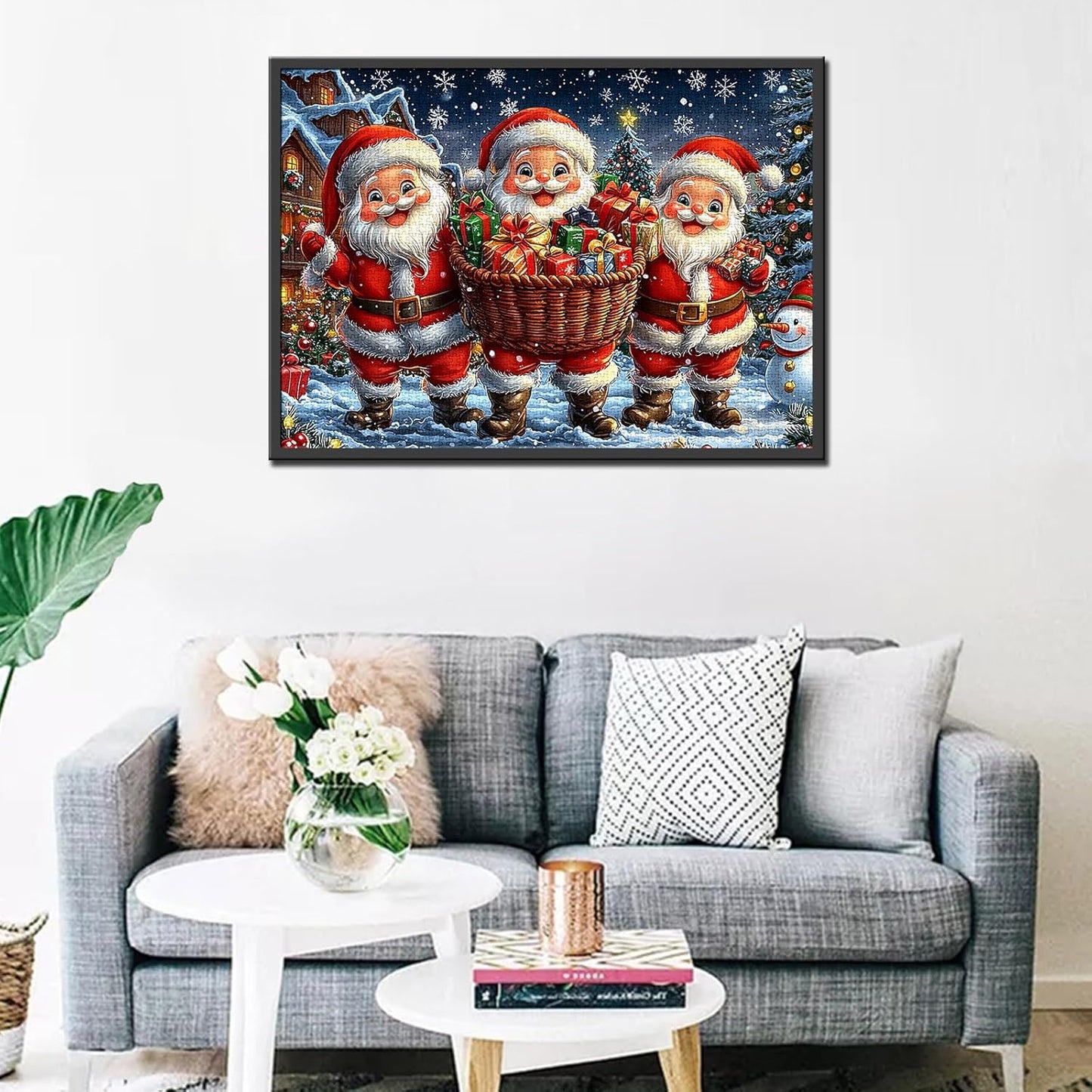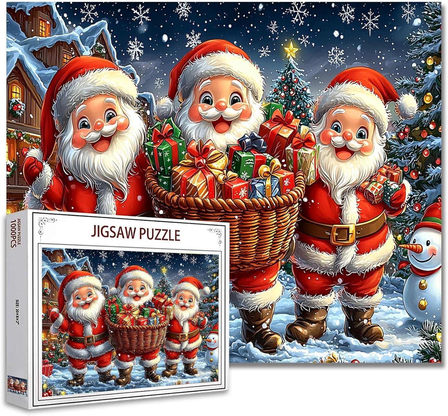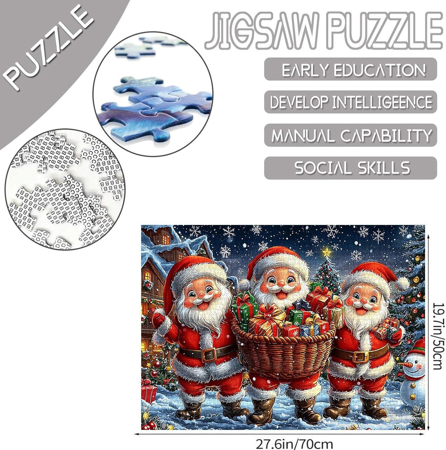 - This festive jigsaw puzzle features three jolly Santas delivering presents in a snowy Christmas village. It's a fun challenge for all ages and makes a delightful holiday decoration. With its vibrant colors and charming design, this puzzle is sure to spread Christmas cheer!