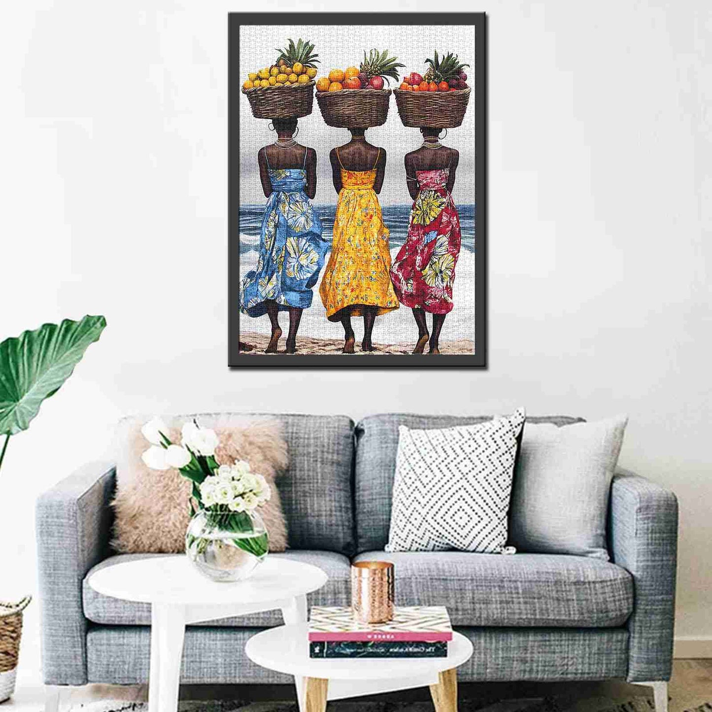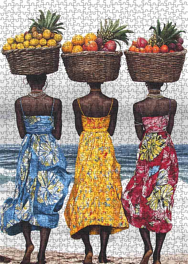 Celebrate vibrant culture and tradition with this captivating jigsaw puzzle featuring three women carrying baskets of tropical fruits atop their heads. Each woman is dressed in brightly patterned dresses in shades of blue, yellow, and red, standing gracefully by the shoreline. The intricate details of the woven baskets, colorful fruits, and flowing garments add depth and authenticity to the scene. This puzzle beautifully captures the essence of coastal life and cultural elegance, making it a delightful challenge for puzzle enthusiasts and art lovers alike.