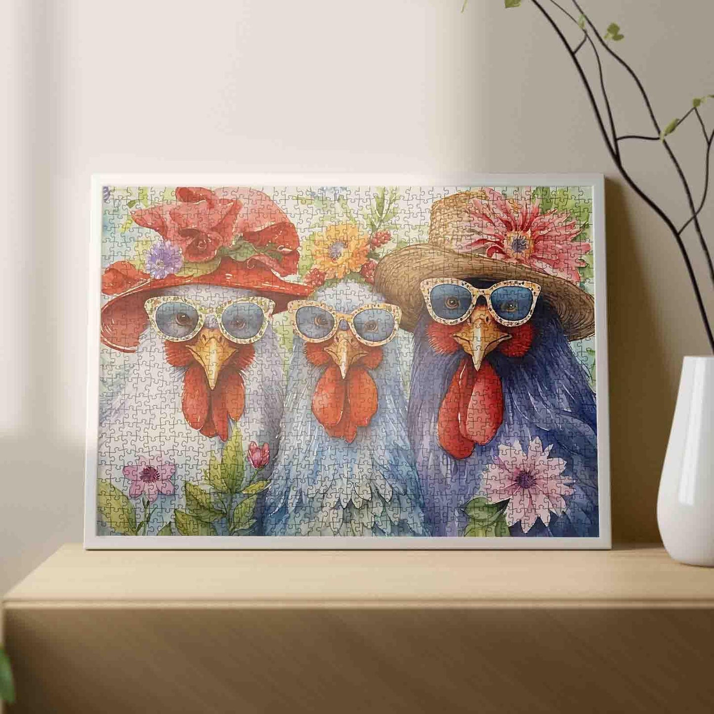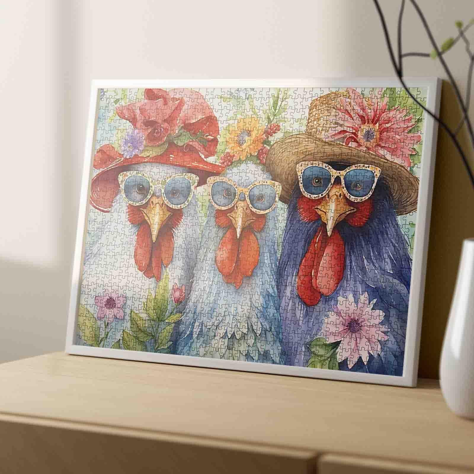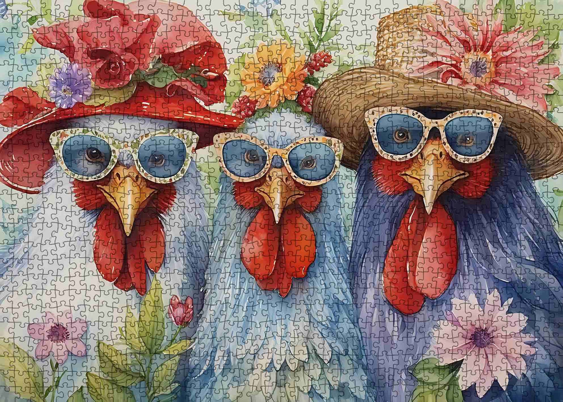 Three fashionable blue roosters strike a pose in oversized sunglasses and flower-trimmed hats, standing confidently among blooming garden flowers. Each rooster brings a different flair—one in a bold red hat, another with a daisy crown, and the last in a woven straw hat. Their playful personalities and coordinated accessories bring smiles and whimsy to anyone assembling this lively puzzle. A delightful piece for animal lovers and humor fans alike, it celebrates individuality, friendship, and fabulous poultry fashion.
