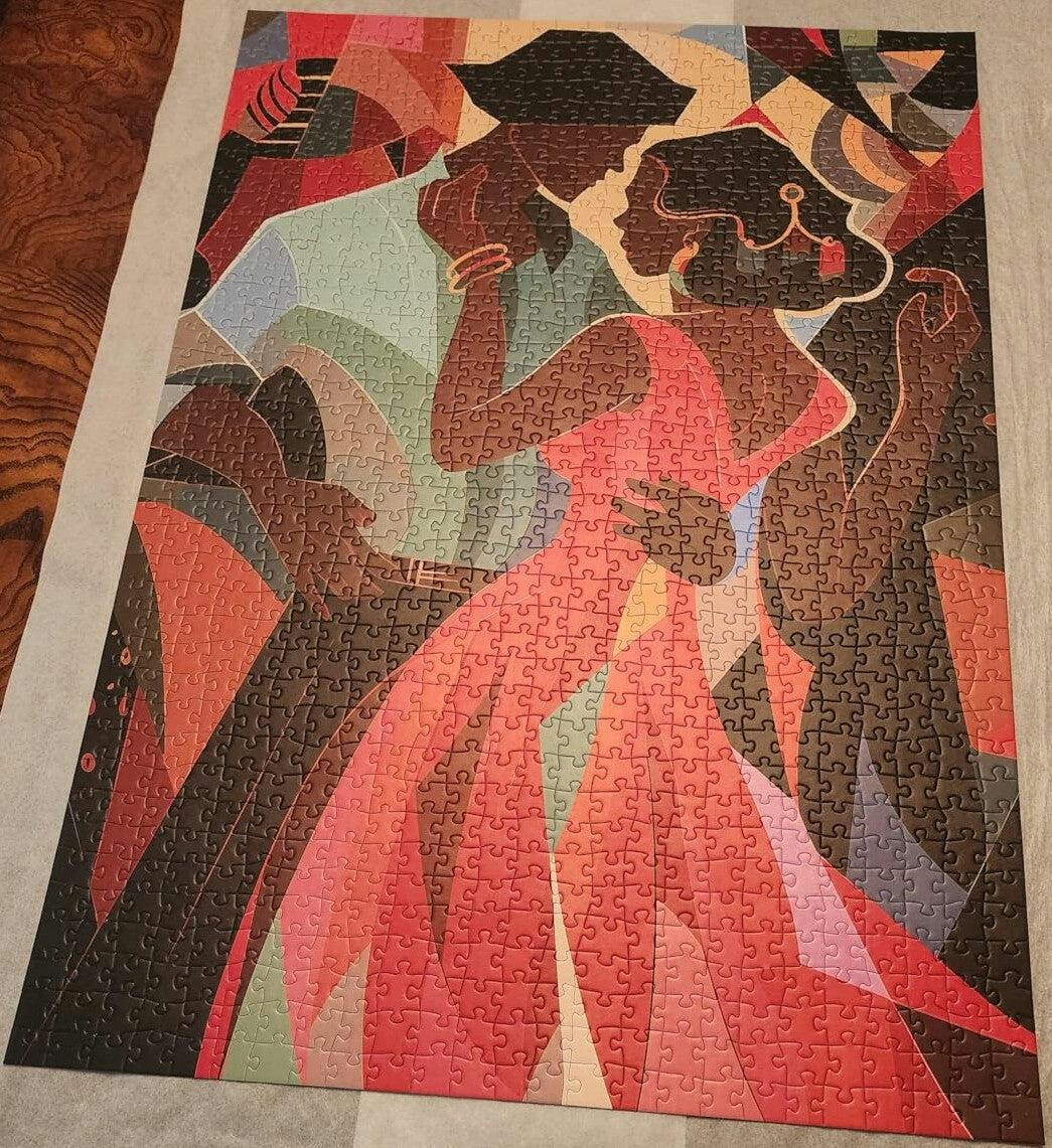 A couple sways under the rhythm of jazz and soul, their silhouettes painted in bold strokes of red, teal, and gold. Her flowing dress twists like flame while his steady hold anchors the dance. Surrounded by abstract shapes and vibrant colors, this puzzle captures the passion of a night full of music, movement, and connection—a tribute to African expression through dance.