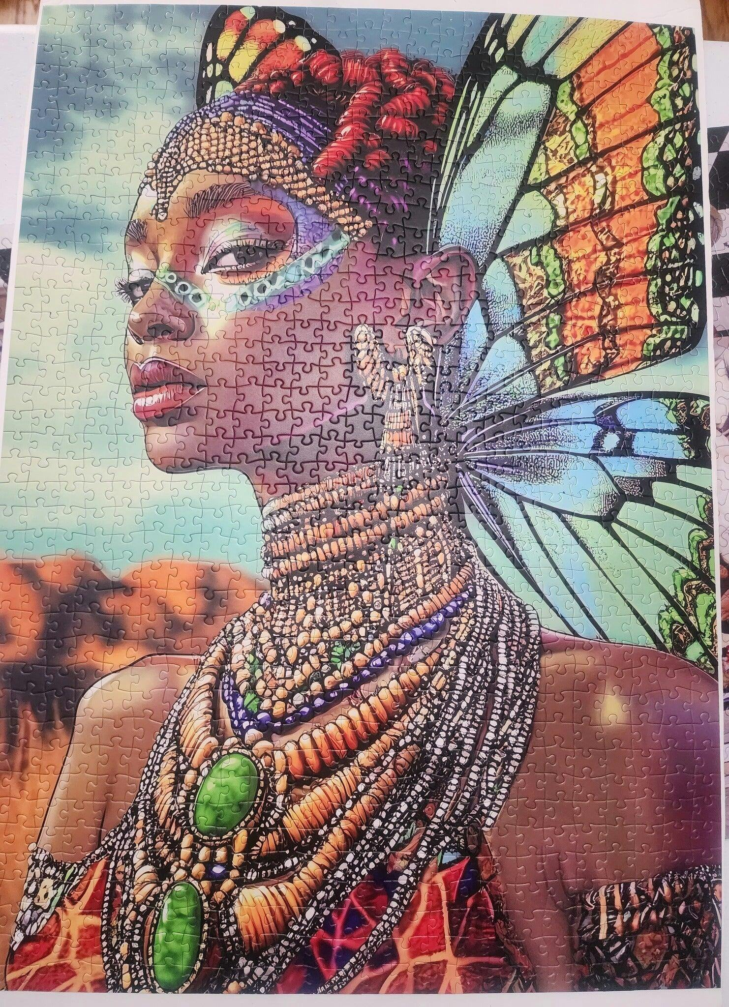 A mesmerizing portrait of a regal African woman with vibrant butterfly wings, adorned in rich tribal jewelry and glowing face paint. This puzzle celebrates cultural pride, feminine power, and mythical beauty. A stunning and empowering piece for both puzzle enthusiasts and art lovers.