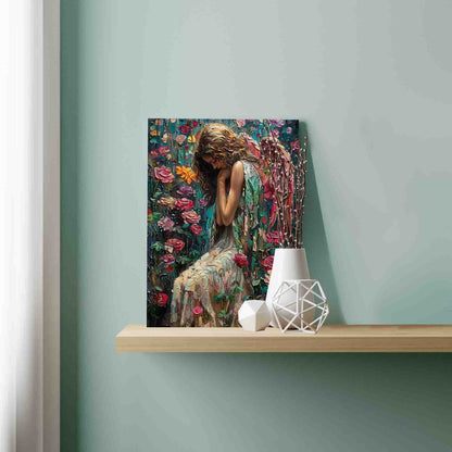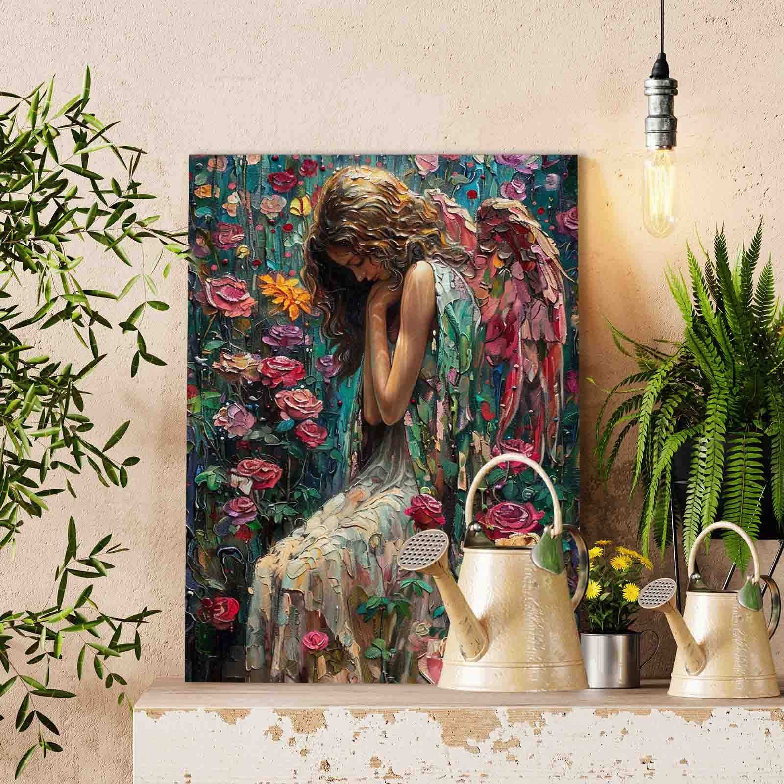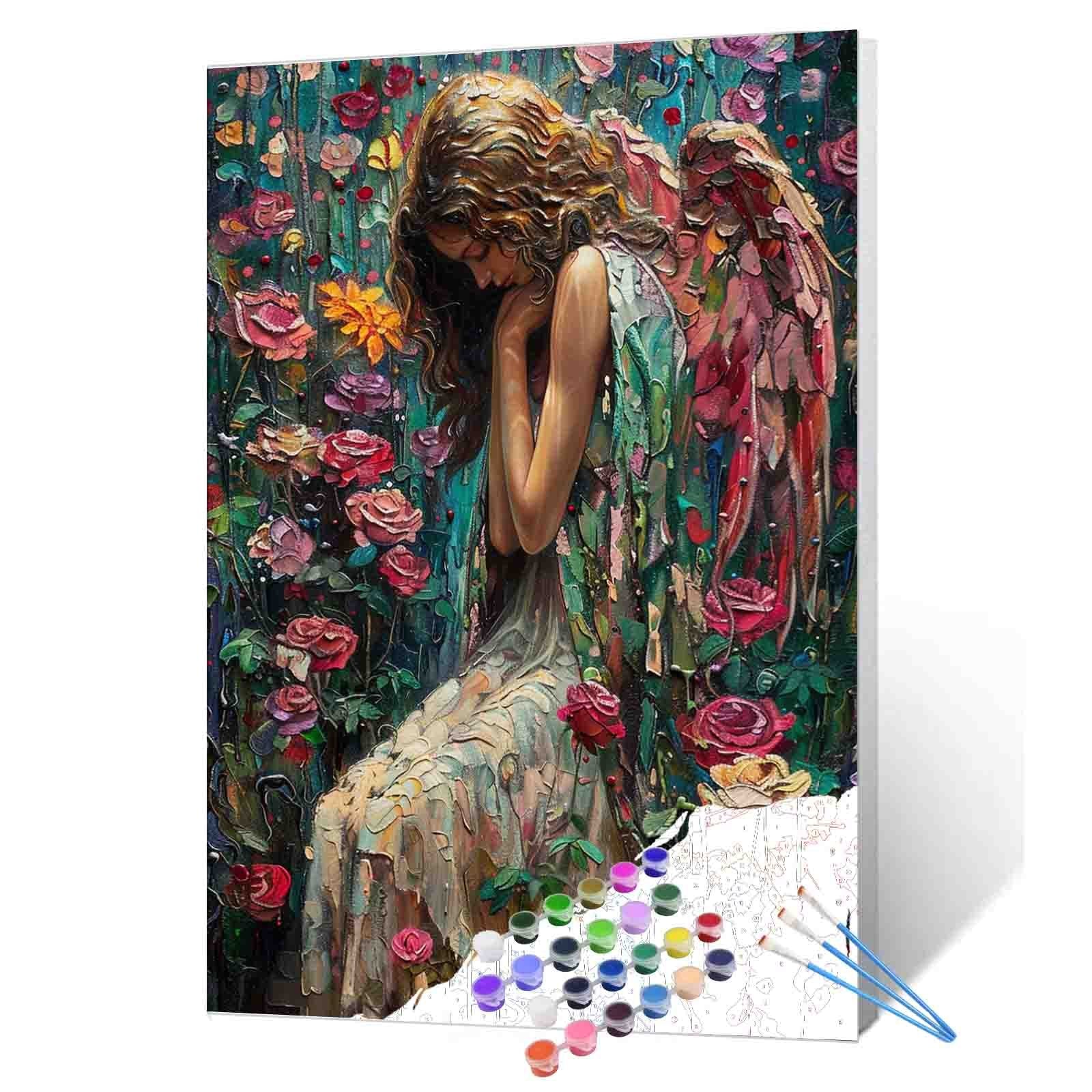 A graceful angel rests gently among a sea of blooming roses, her delicate wings painted with soft hues of pink and gold. As she lowers her head in quiet contemplation, the vibrant flowers surrounding her seem to echo her peaceful moment. The petals of the roses are beautifully detailed, each one vivid and full of life, bringing warmth and tranquility to the scene. The angel’s flowing gown blends seamlessly with the lush garden, as though she is part of the natural world itself. Each brushstroke brings you closer to capturing the serenity of this divine encounter, offering a relaxing and therapeutic experience as you watch this peaceful moment come to life.