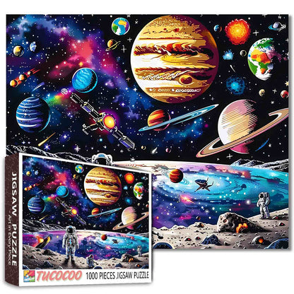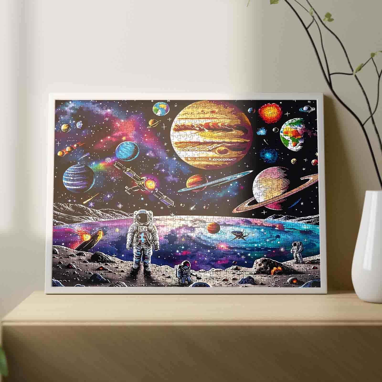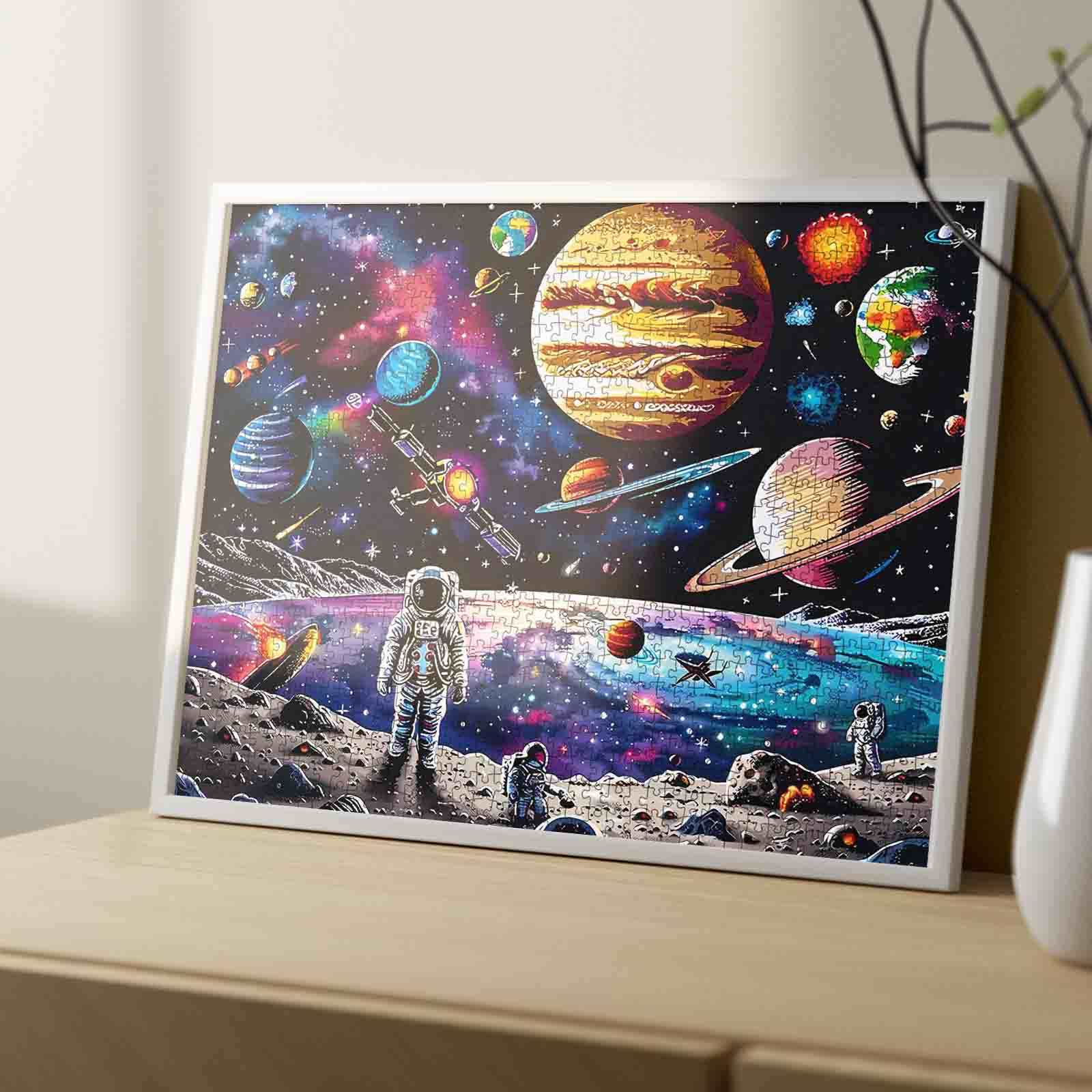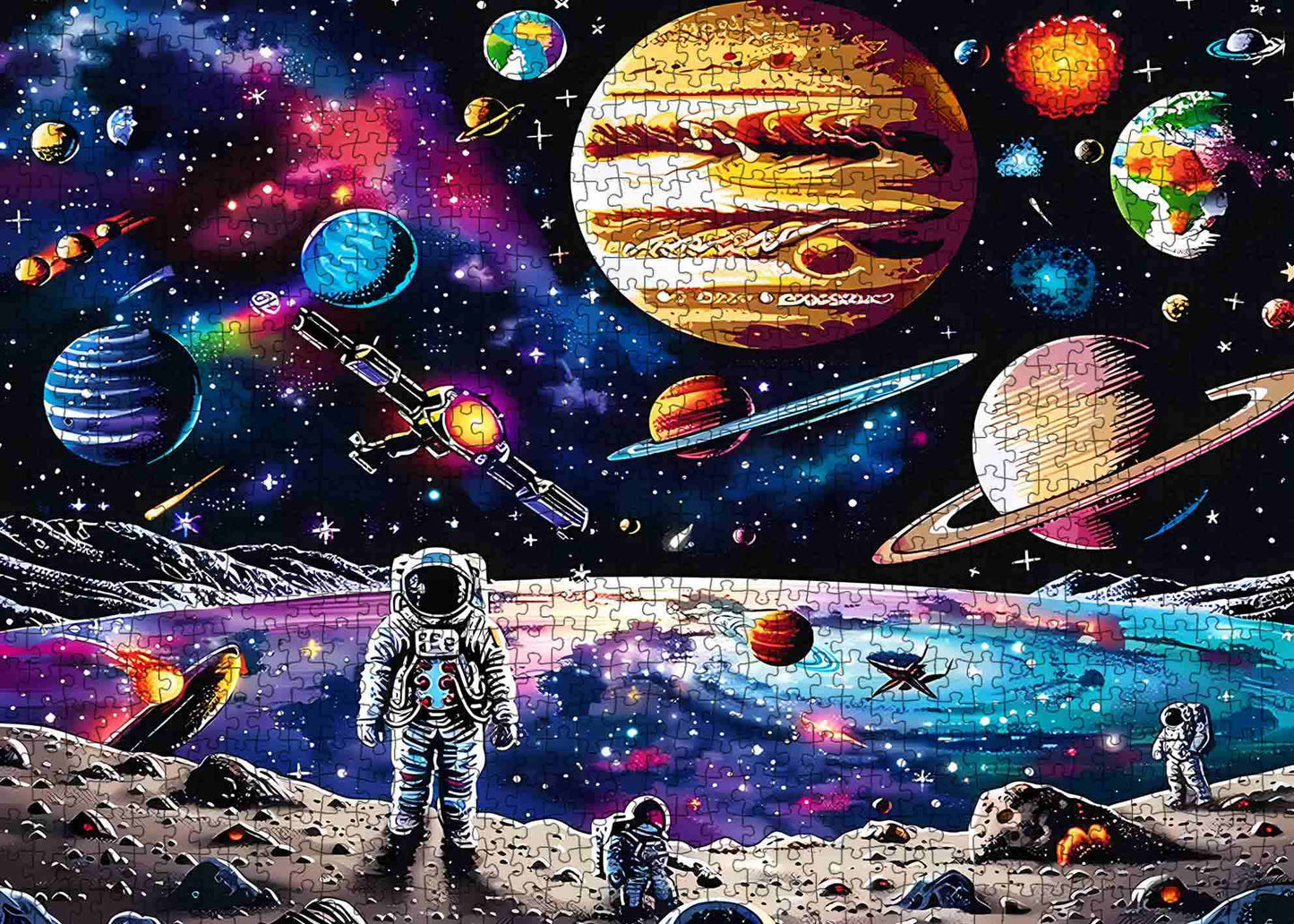 Two astronauts stand on a cratered moon, gazing into a galaxy filled with planets, comets, satellites, and swirling stars. The whimsical palette of purple, gold, and electric blue creates a mesmerizing dreamscape of outer space. Every corner of this puzzle bursts with colorful cosmic wonder, blending imagination and science fiction into one vivid scene.